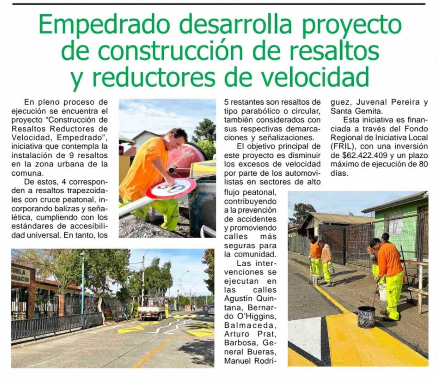 Empedrado desarrolla proyecto de construcción de resaltos y reductores de velocidad