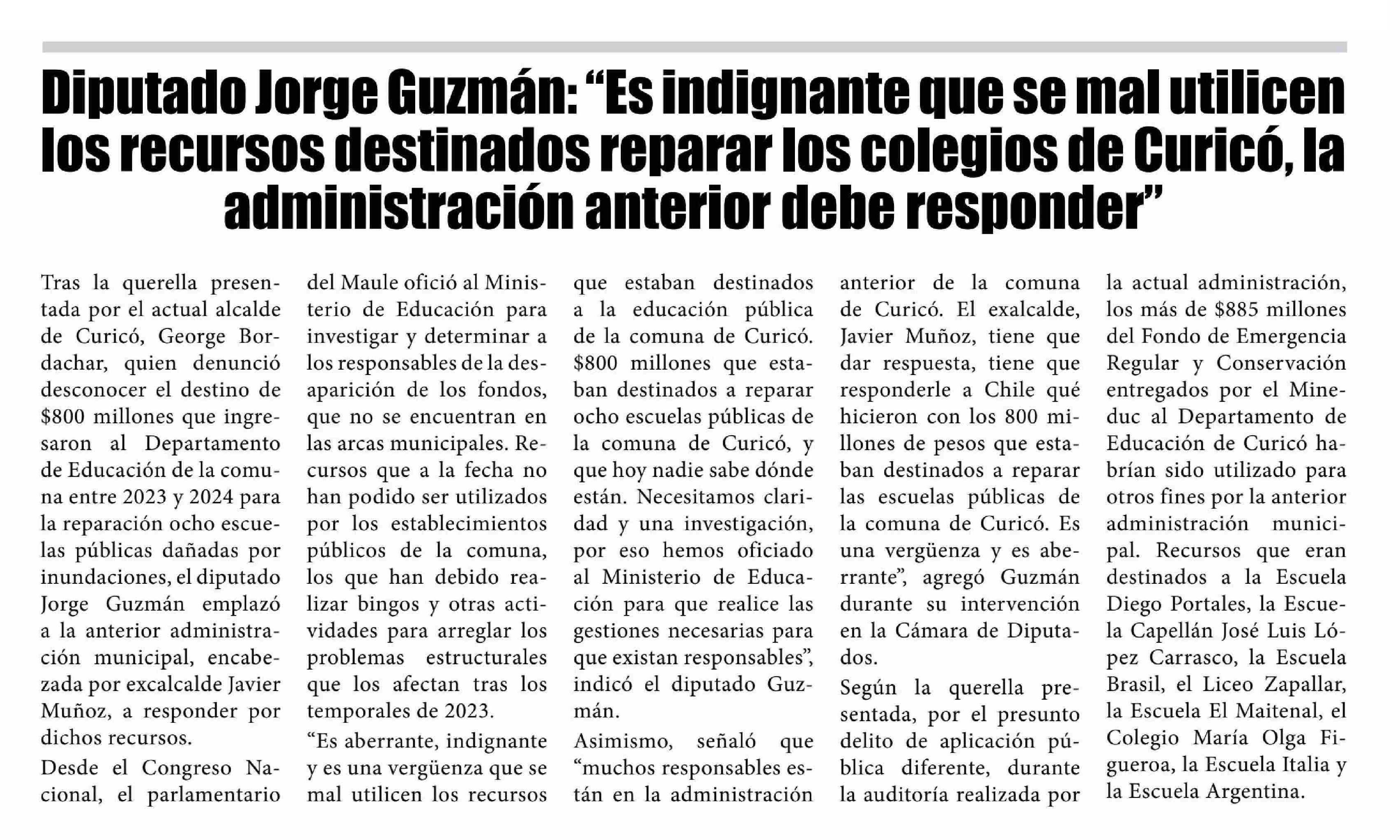 Título: Diputado Jorge Guzmán: “Es indignante que se mal utilicen los recursos destinados reparar los colegios de Curicó, la administración anterior debe responder”