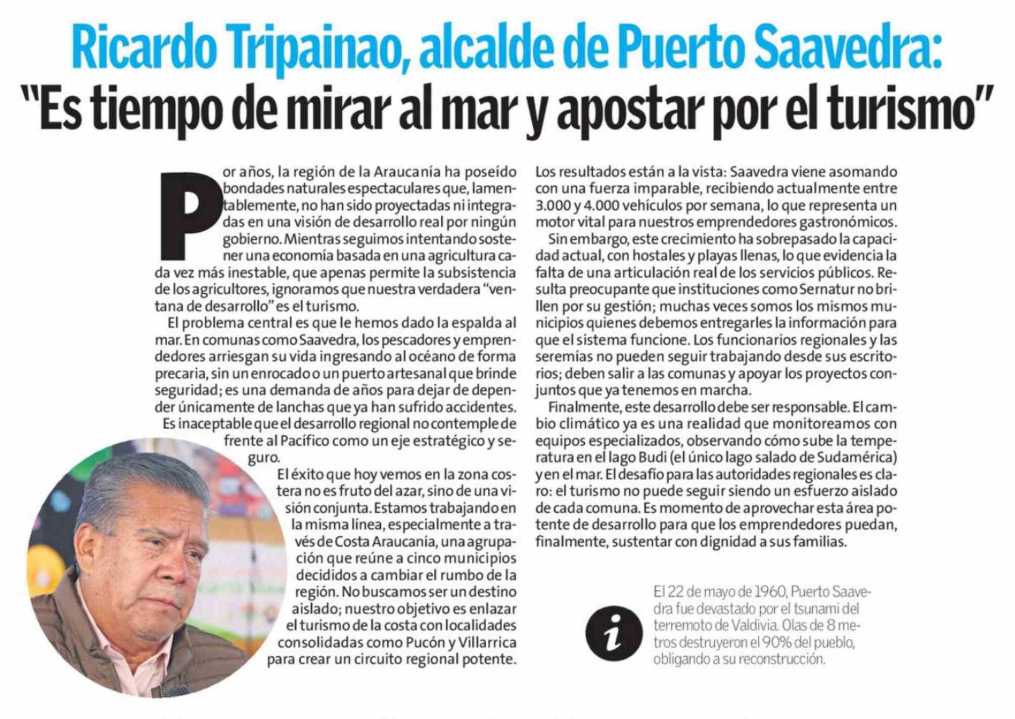 | Título: | Columnas de Opinión: Ricardo Tripainao, alcalde de Puerto Saavedra: "Es tiempo de mirar al mar y apostar por el turismo" |