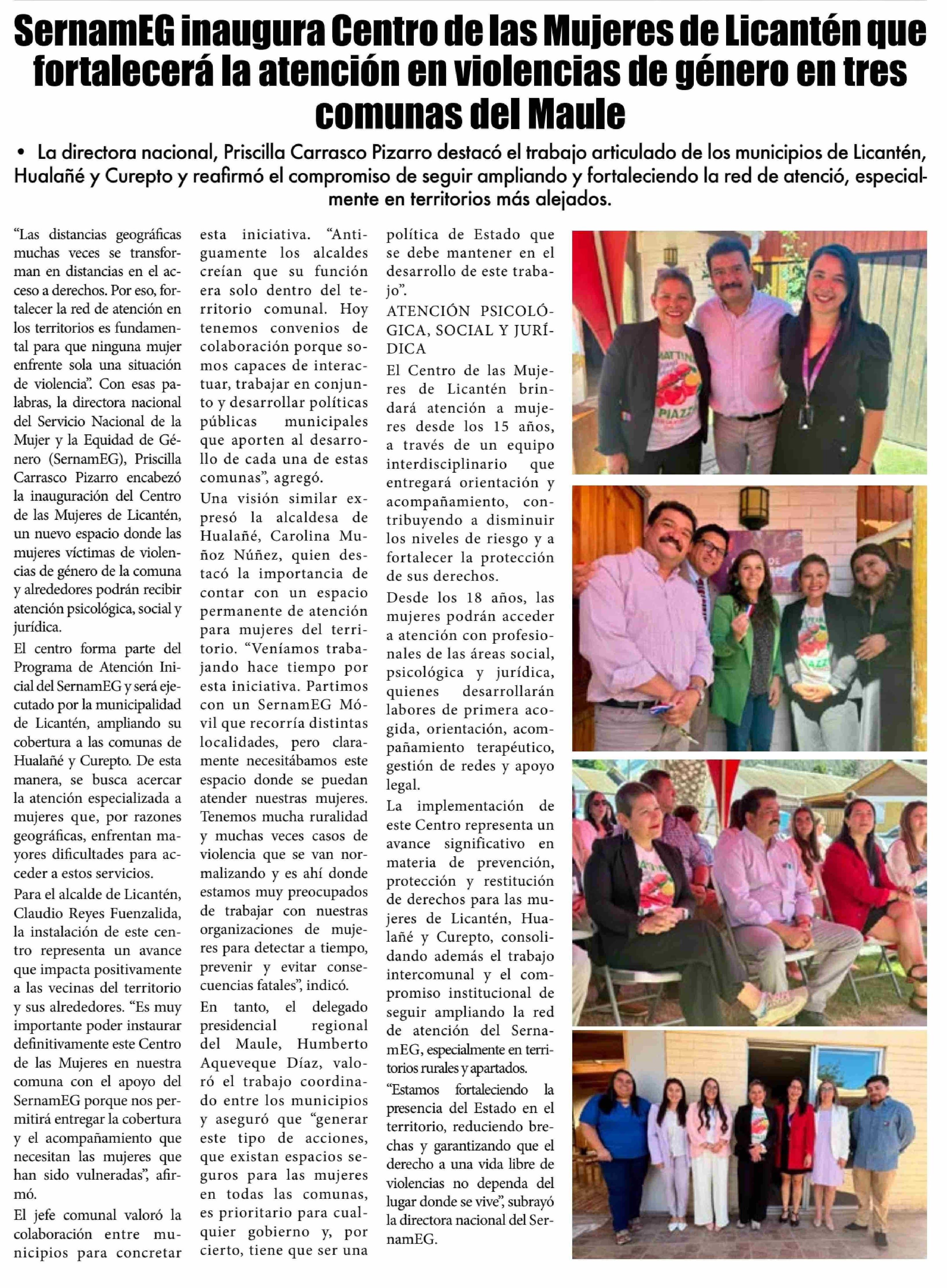 SernamEG inaugura Centro de las Mujeres de Licantén que fortalecerá la atención en violencias de género en tres comunas del Maule