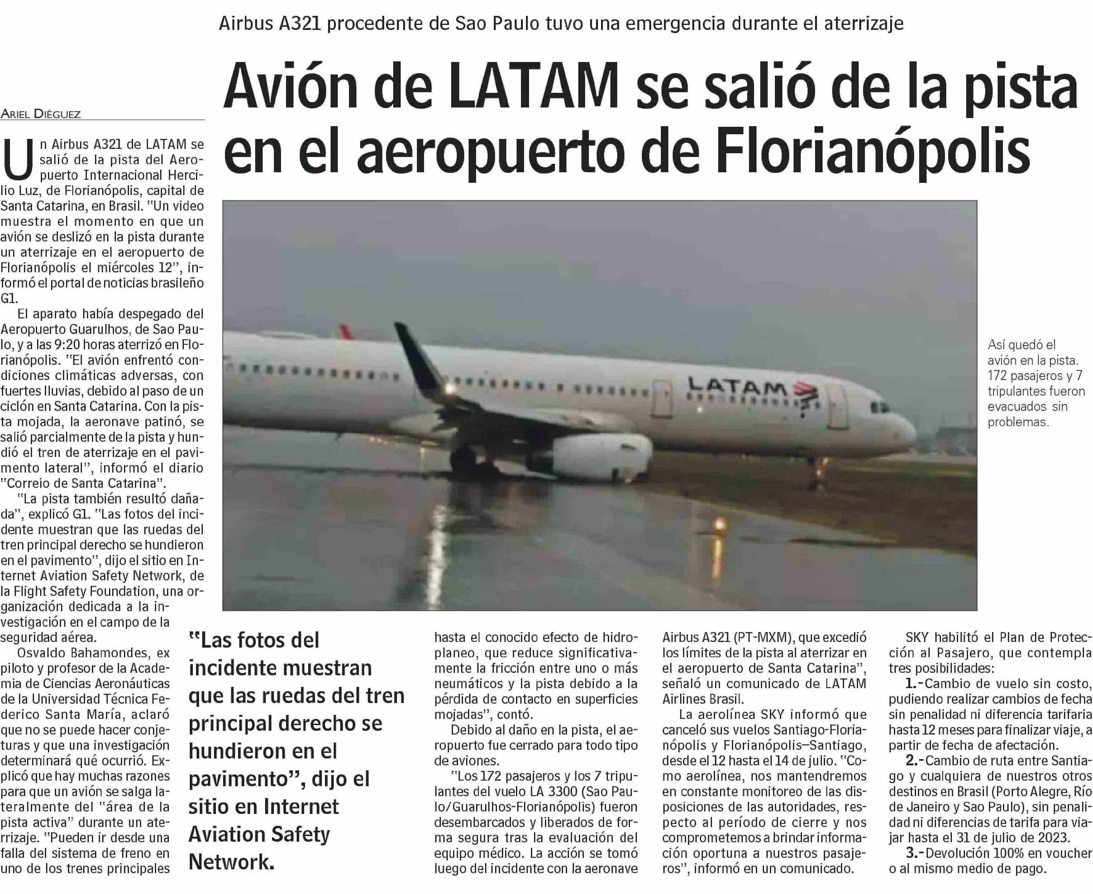 Avión de LATAM se salió de la pista en el aeropuerto de Florianópolis