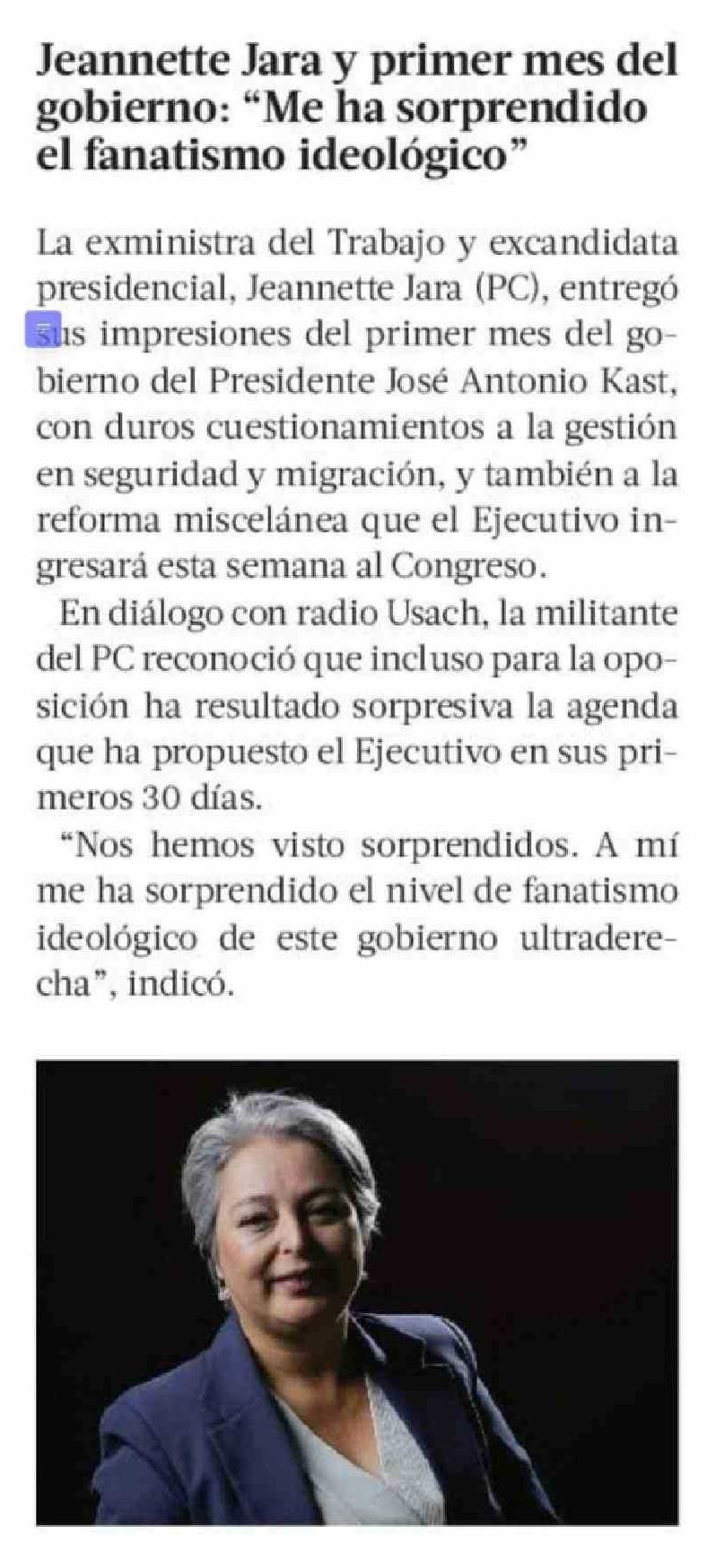 Jeannette Jara y primer mes del gobierno: "Me ha sorprendido el fanatismo ideológico"