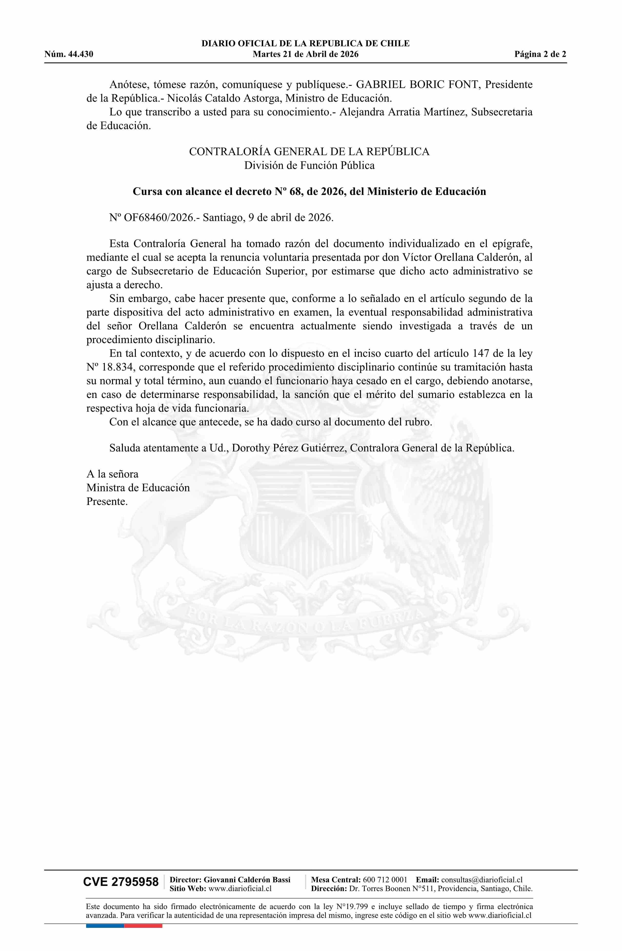 | Título: | Decreto número 68, de 2026.- Acepta renuncia de don Víctor Sebastián Orellana Calderón al cargo de Subsecretario de Educación Superior |