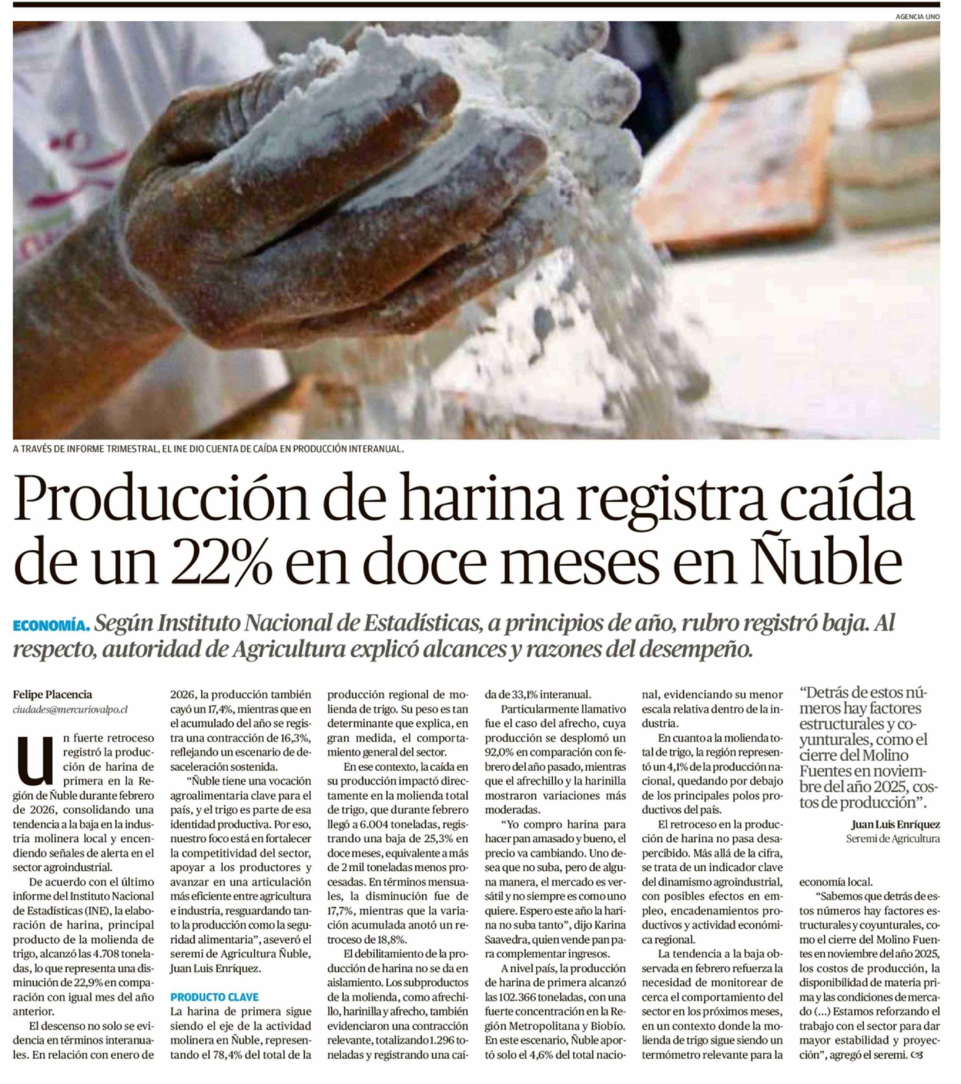 Producción de harina registra caída de un 22% en doce meses en Ñuble