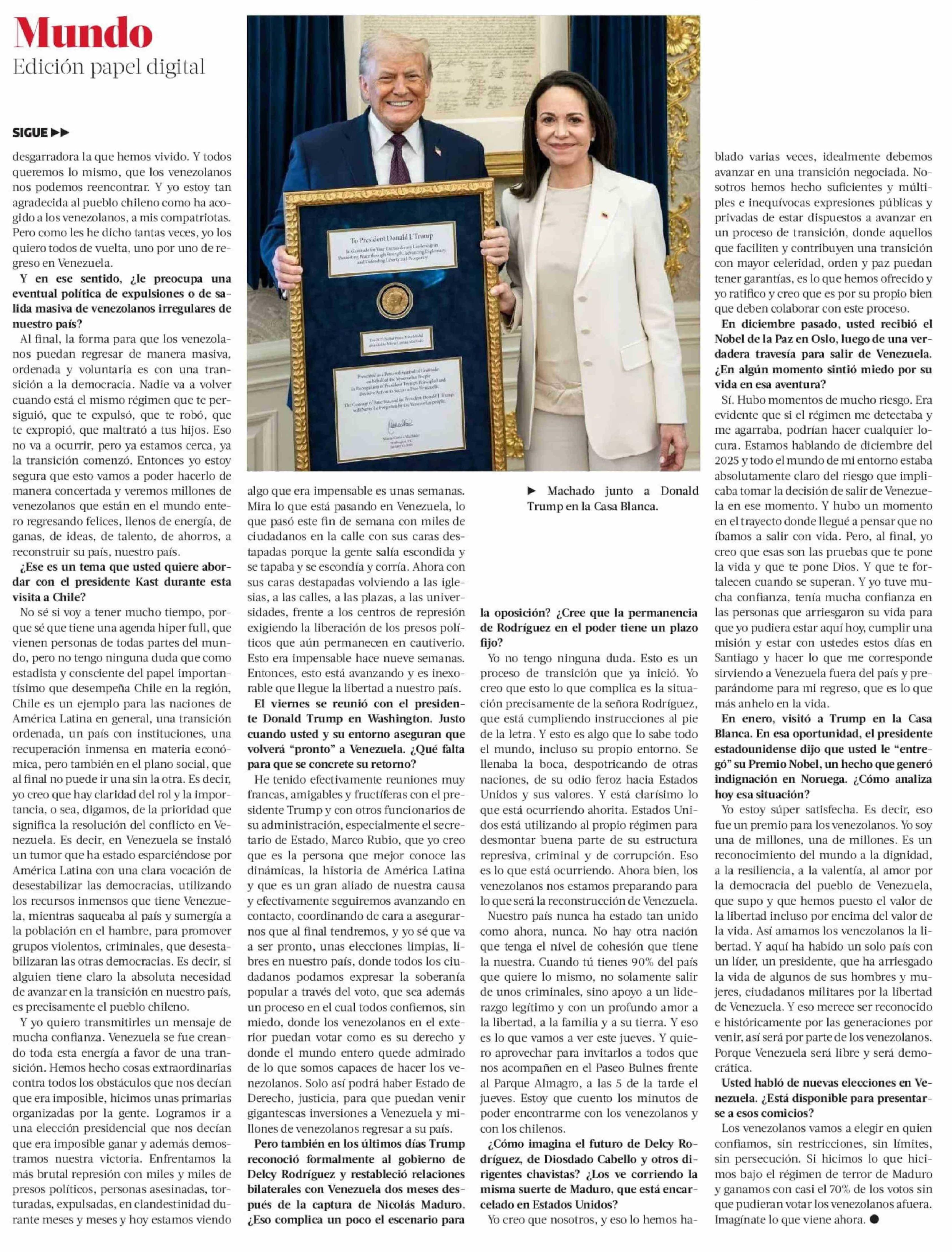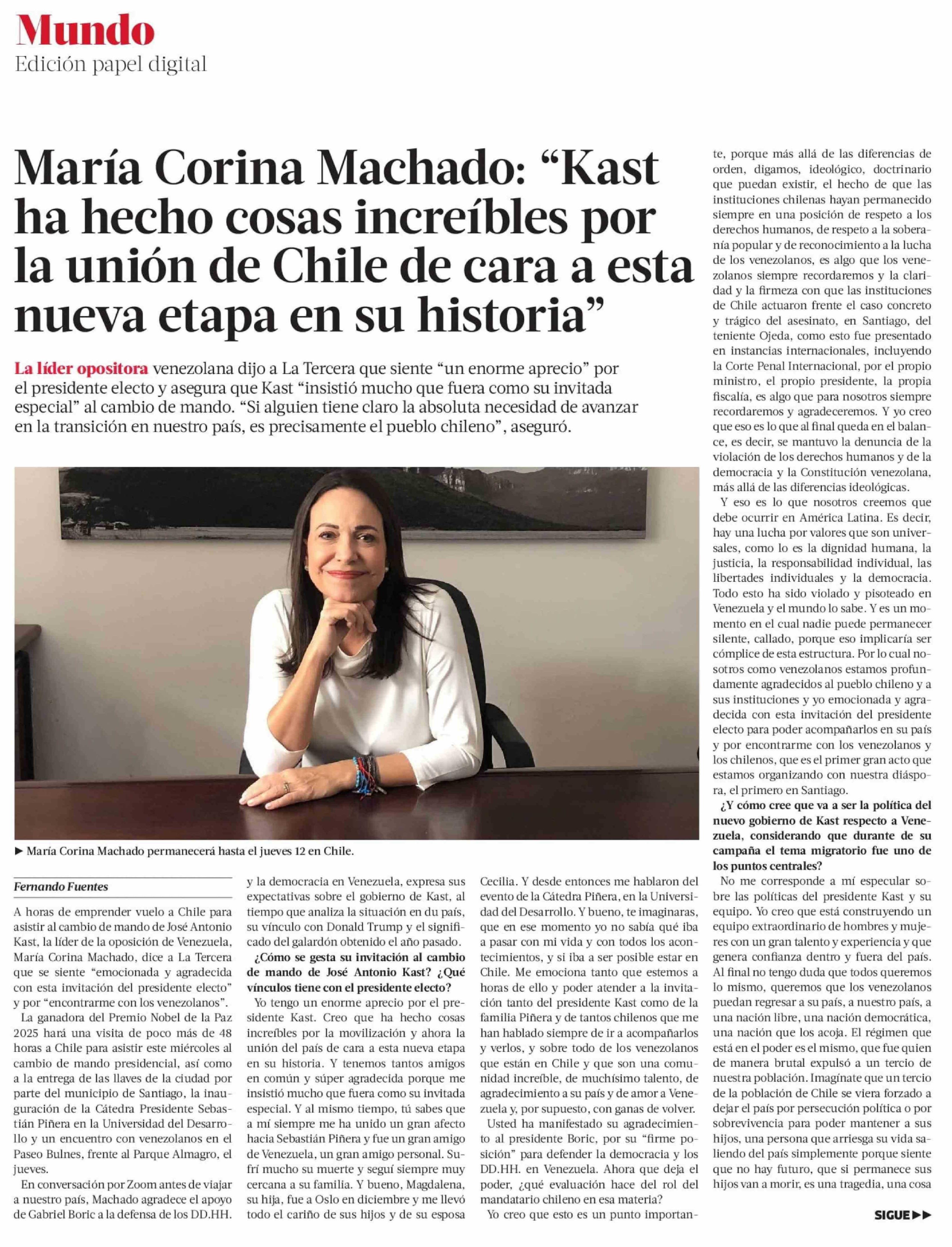 María Corina Machado: "Kast ha hecho cosas increíbles por la unión de Chile de cara a esta nueva etapa en su historia"