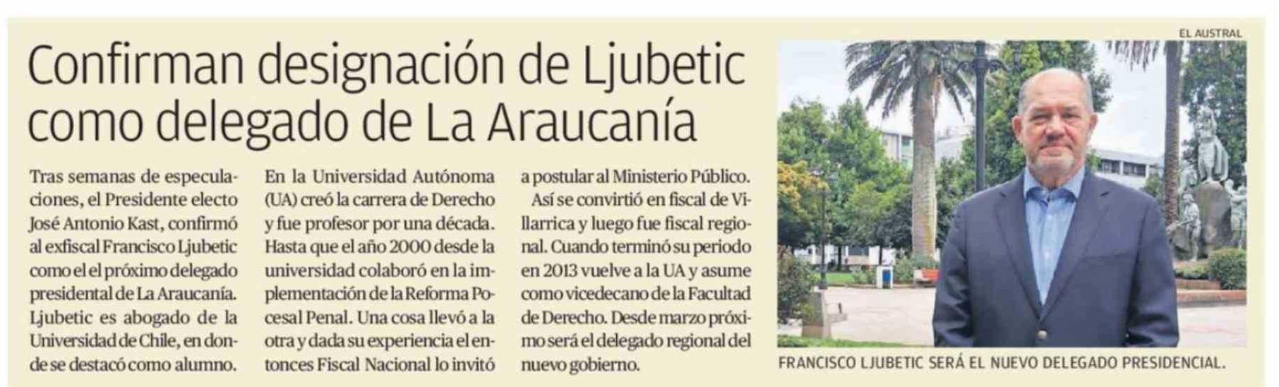 Confirman designación de Ljubetic como delegado de La Araucanía