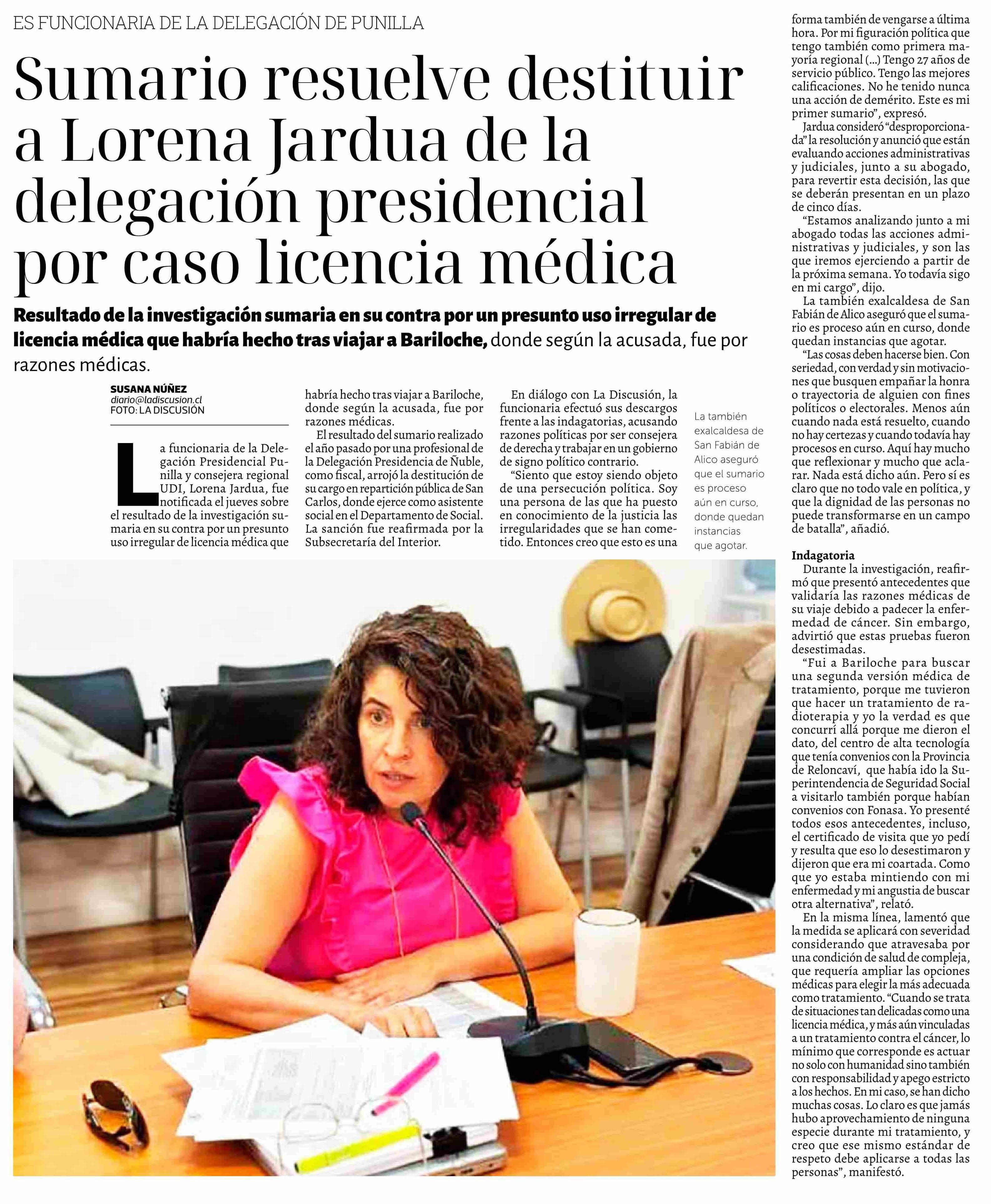 Sumario resuelve destituir a Lorena Jardua de la delegación presidencial por caso licencia médica