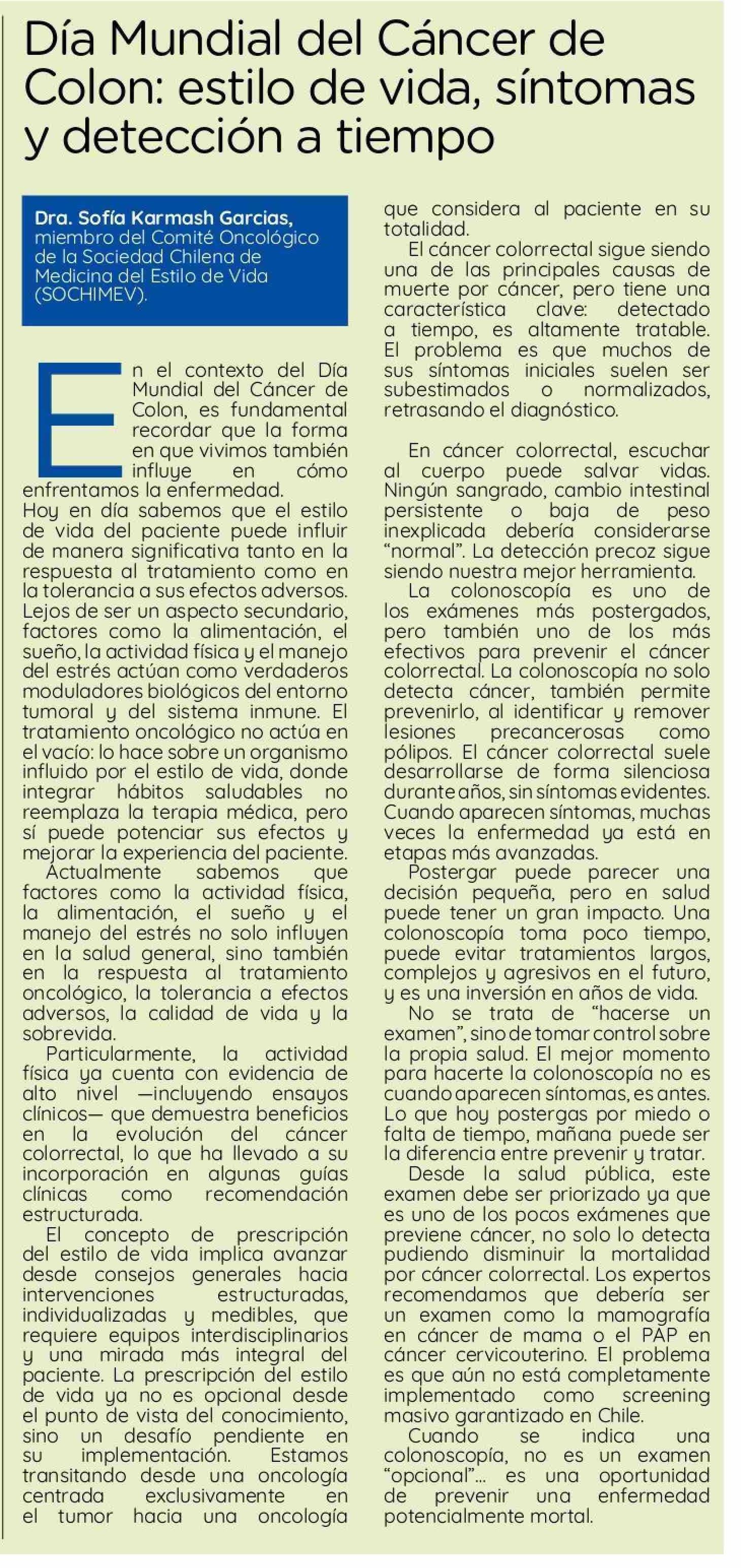Título: Día Mundial del Cáncer de Colon: estilo de vida, síntomas y detección a tiempo