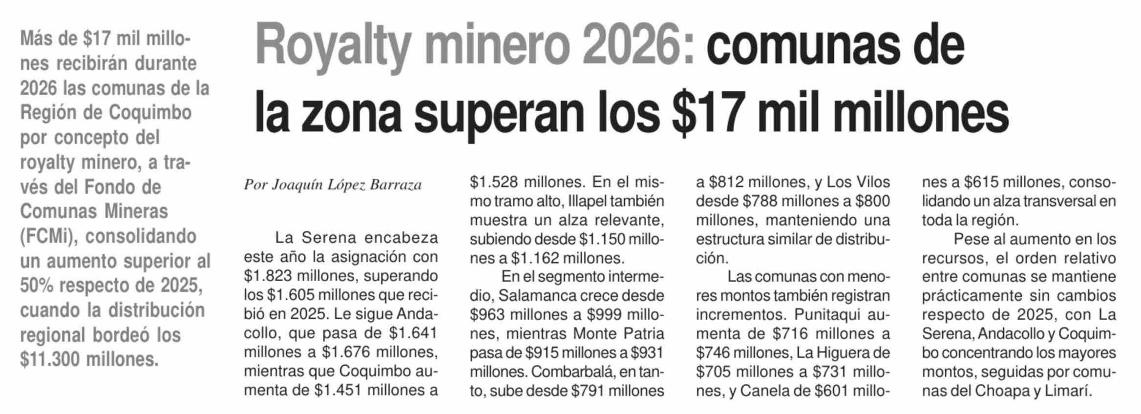 Royalty minero 2026: comunas de la zona superan los $17 mil millones