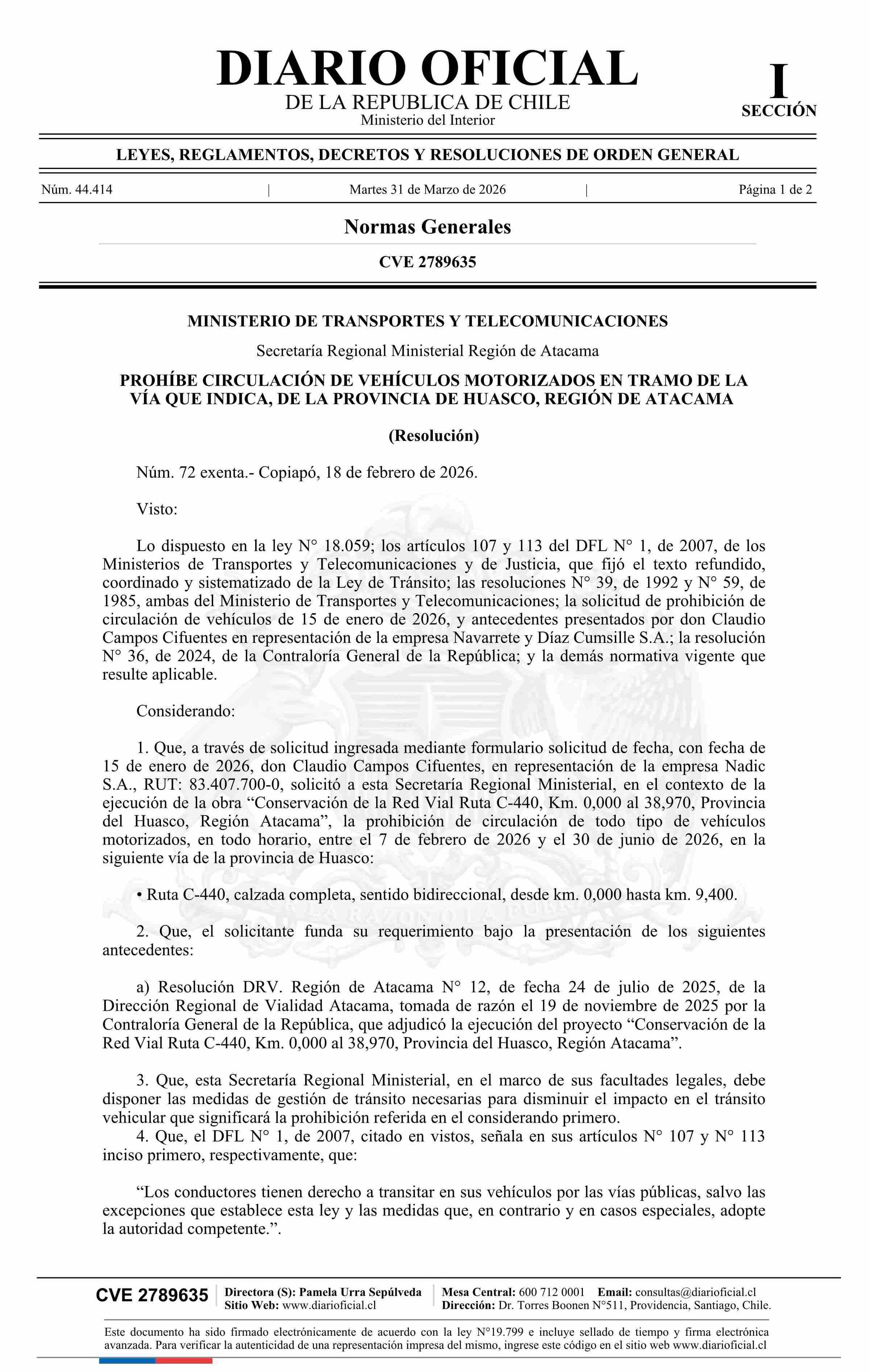 Título: MINISTERIO DE TRANSPORTES Y TELECOMUNICACIONES Secretaría Regional Ministerial Región de Atacama PROHÍBE CIRCULACIÓN DE VEHÍCULOS MOTORIZADOS EN TRAMO DE LA VIA QUE INDICA, DE LA PROVINCIA DE HUASCO, REGIÓN DE ATACAMA
