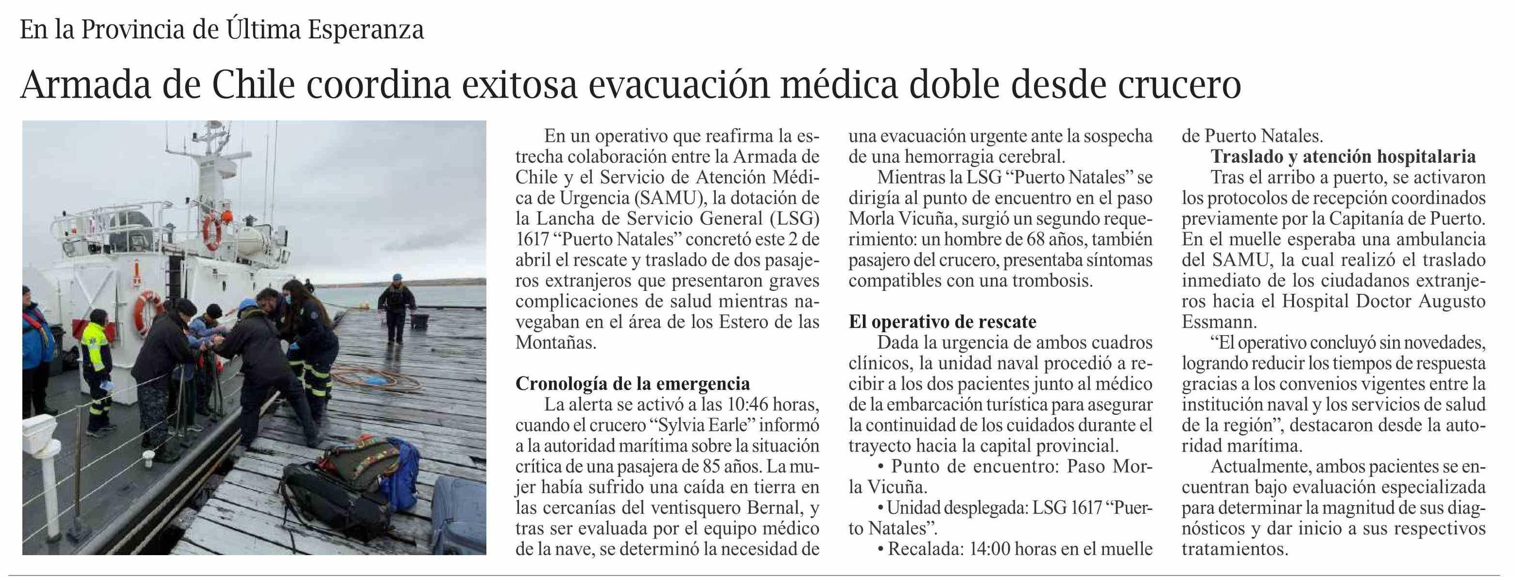Armada de Chile coordina exitosa evacuación médica doble desde crucero