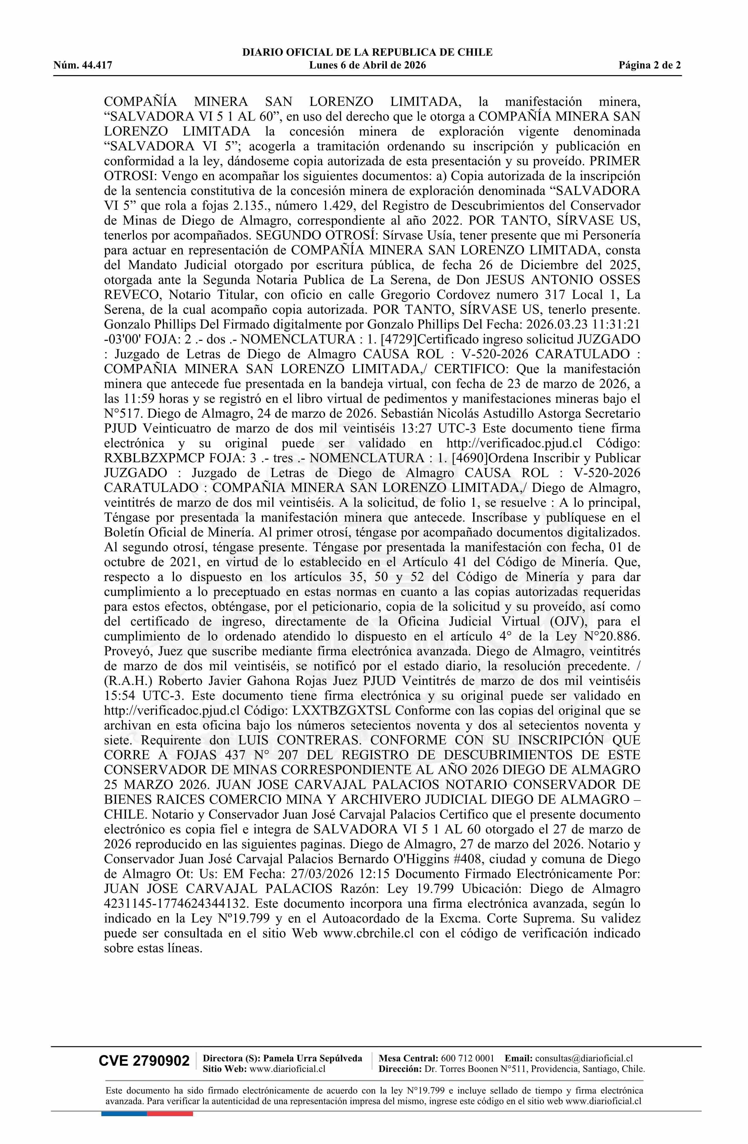 SALVADORA VI 5 1 AL 60 / Compañía Minera San Lorenzo Limitada