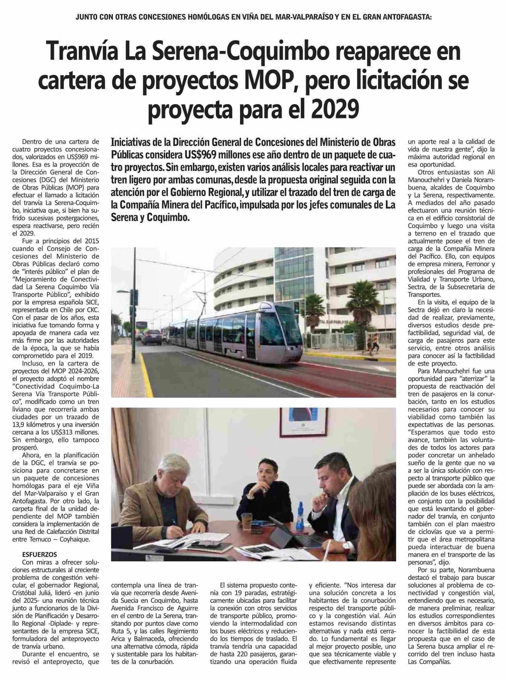 Tranvía La Serena-Coquimbo reaparece en cartera de proyectos MOP, pero licitación se proyecta para el 2029