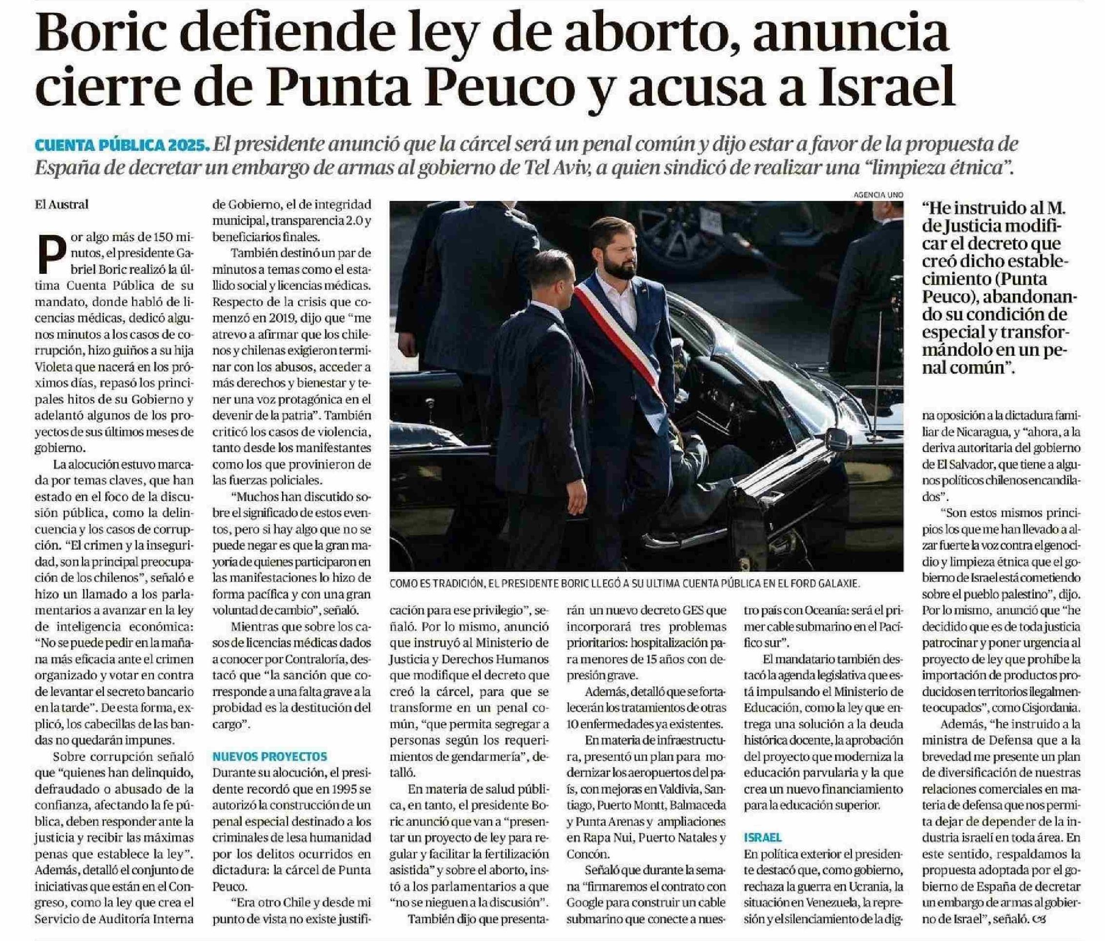 Boric defiende ley de aborto, anuncia cierre de Punta Peuco y acusa a Israel