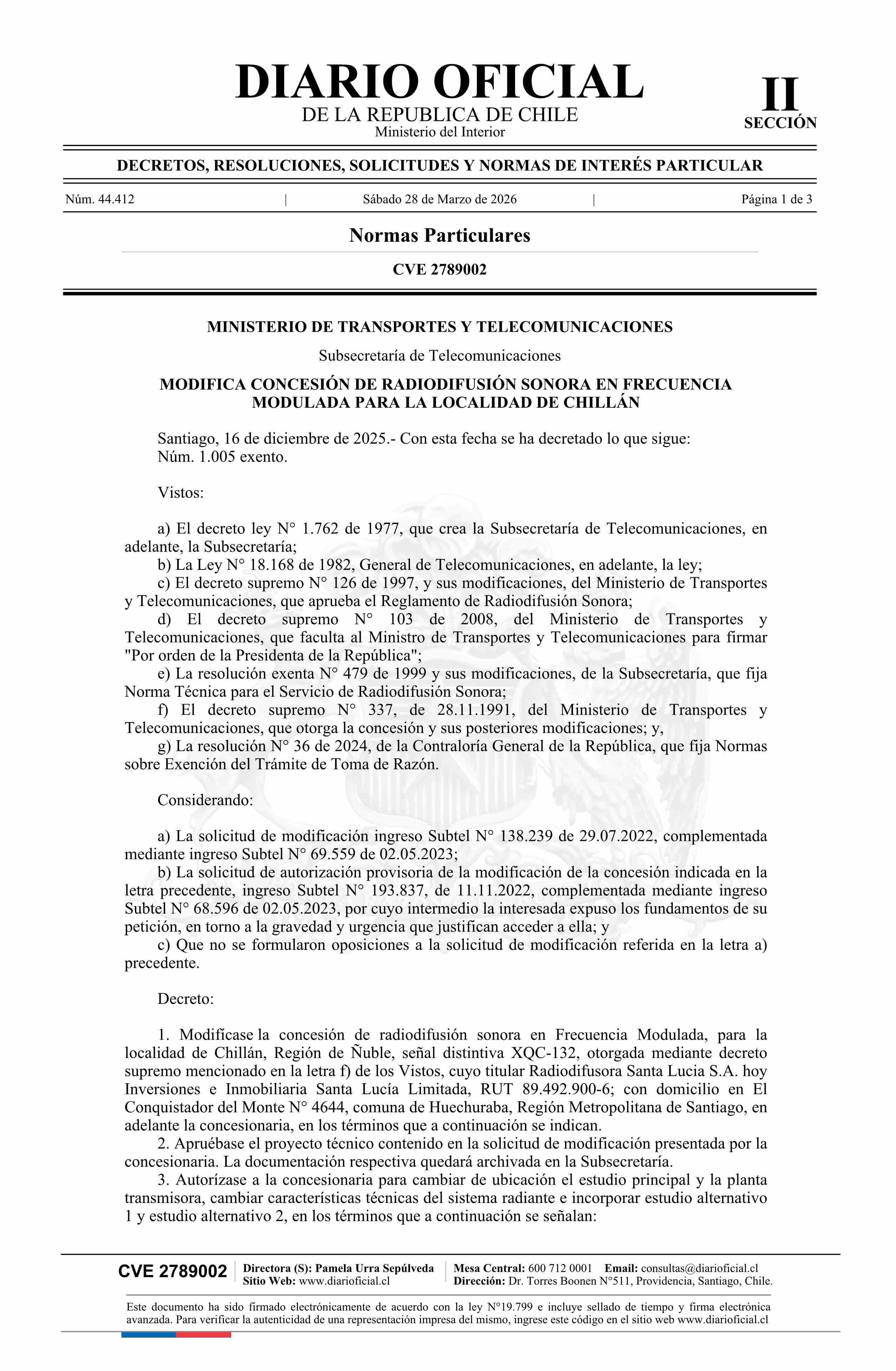 | Título: | Decreto exento número 1.005, de 2025.- Modifica concesión de radiodifusión sonora en frecuencia modulada para la localidad de Chillán |