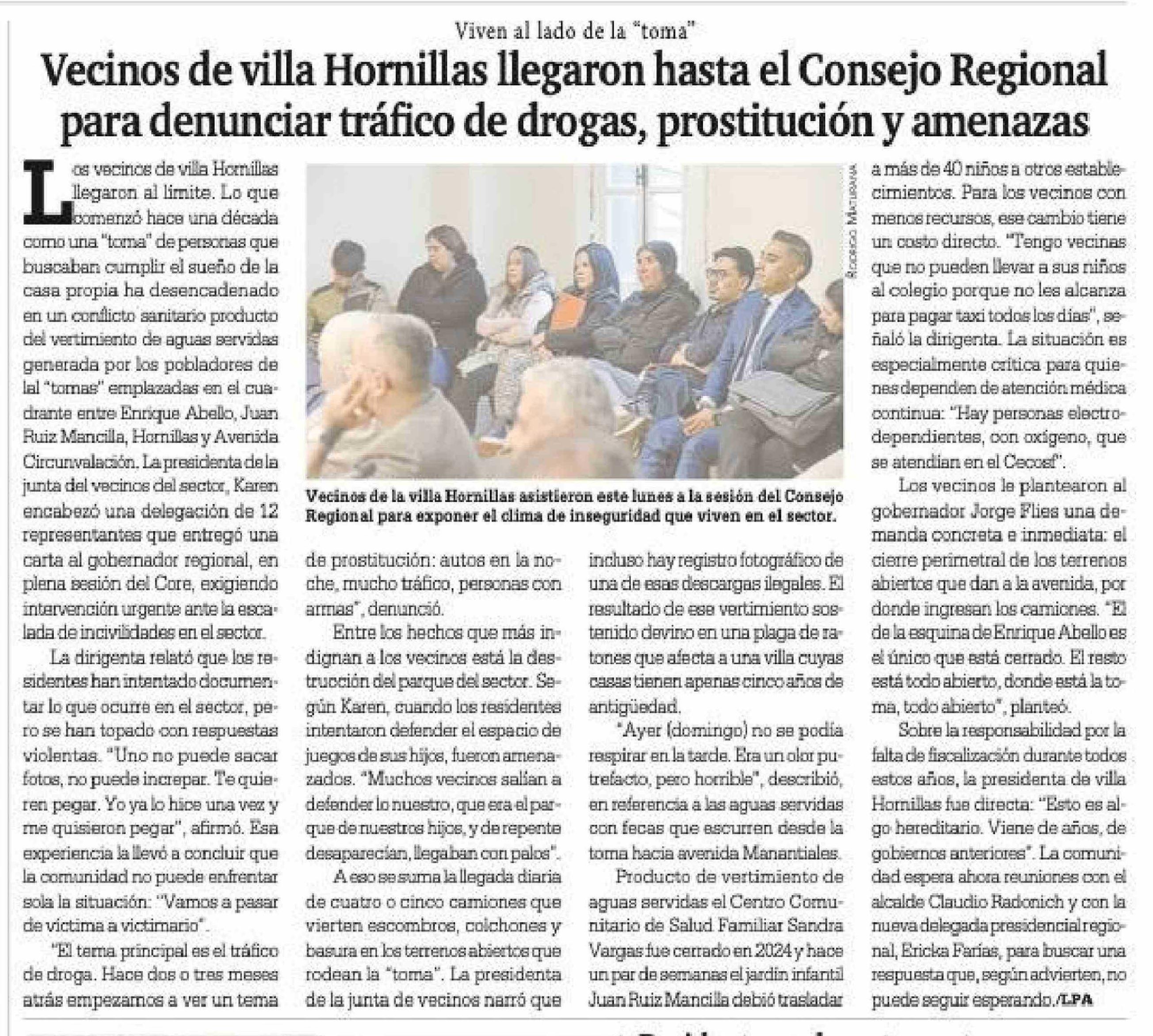 Vecinos de villa Hornillas llegaron hasta el Consejo Regional para denunciar tráfico de drogas, prostitución y amenazas