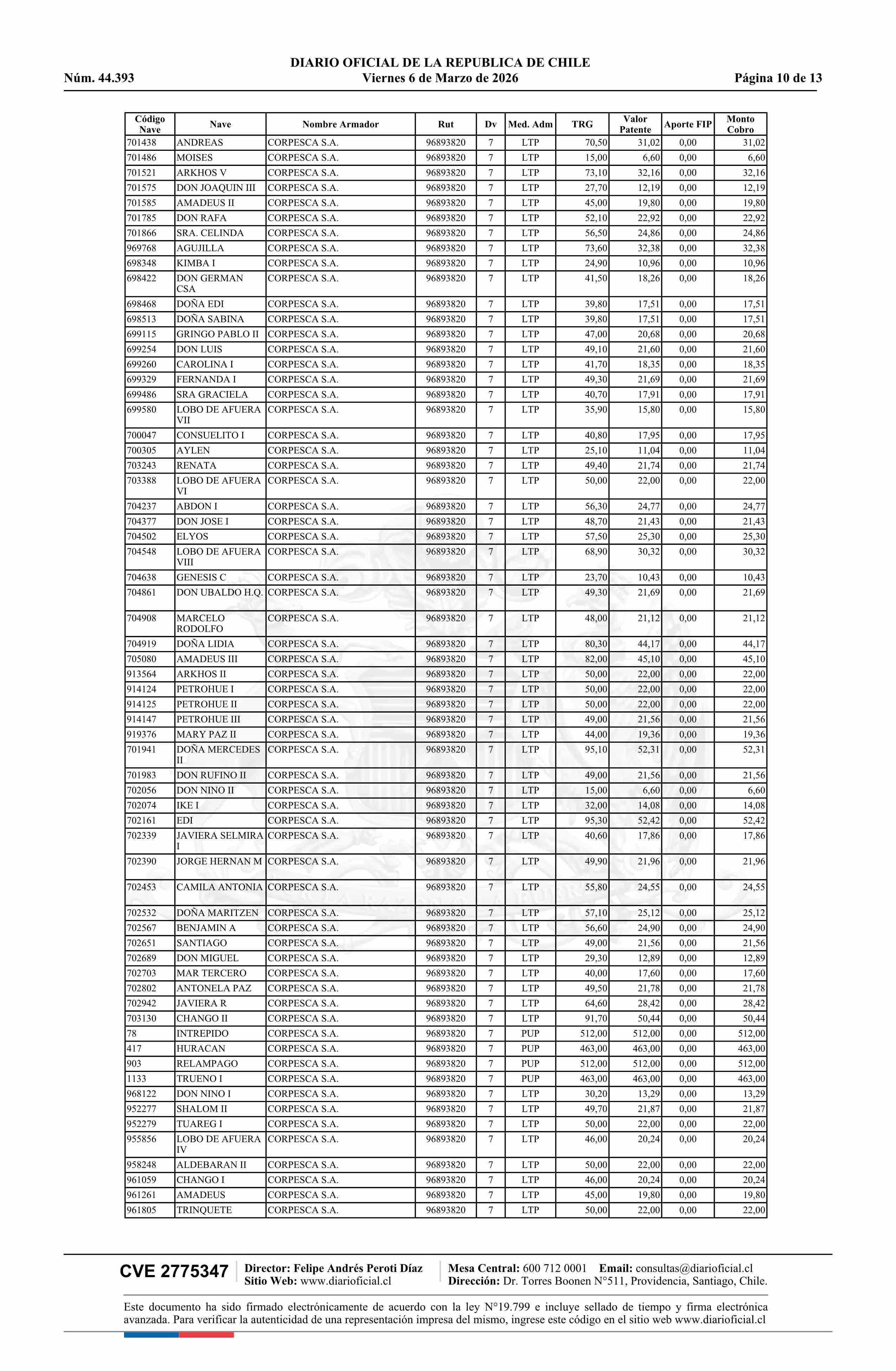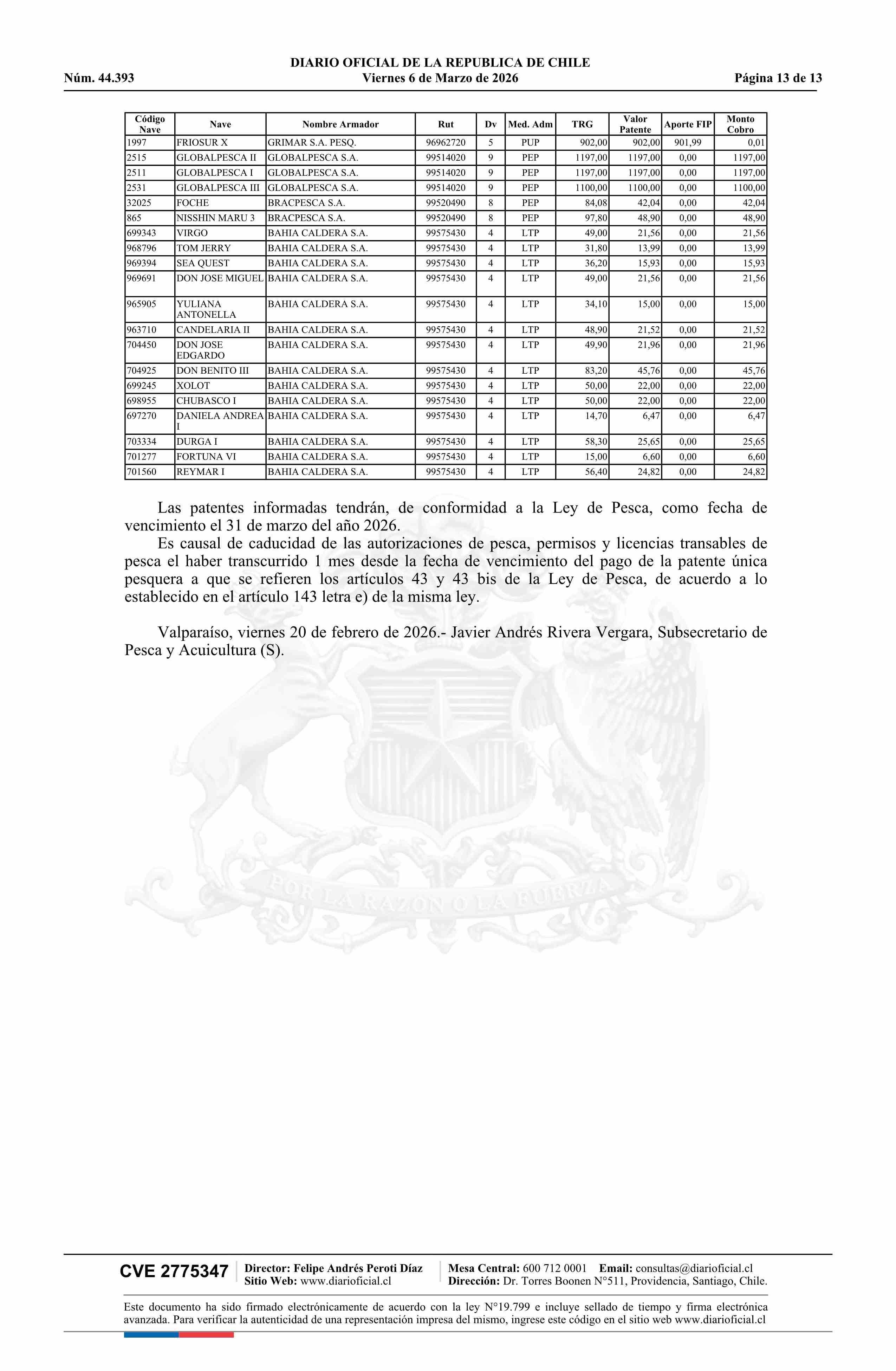 | Título: | Extracto de resolución exenta número 481, de 2026.- Informa valor de patente única pesquera de los artículos 43 y 43 bis de la Ley General de Pesca y Acuicultura, año 2026 |