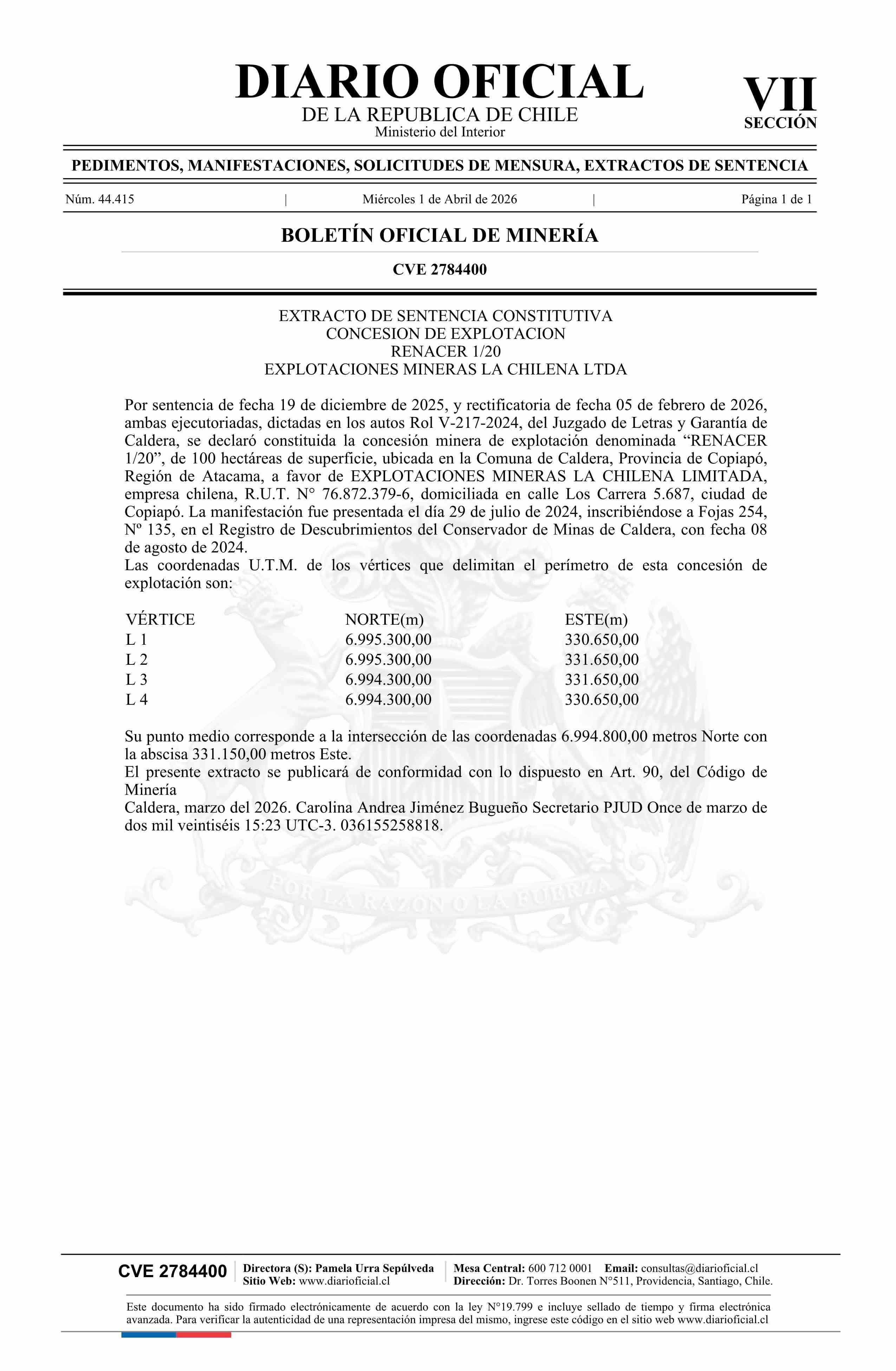 RENACER 1/20 / Explotaciones Mineras La Chilena Limitada