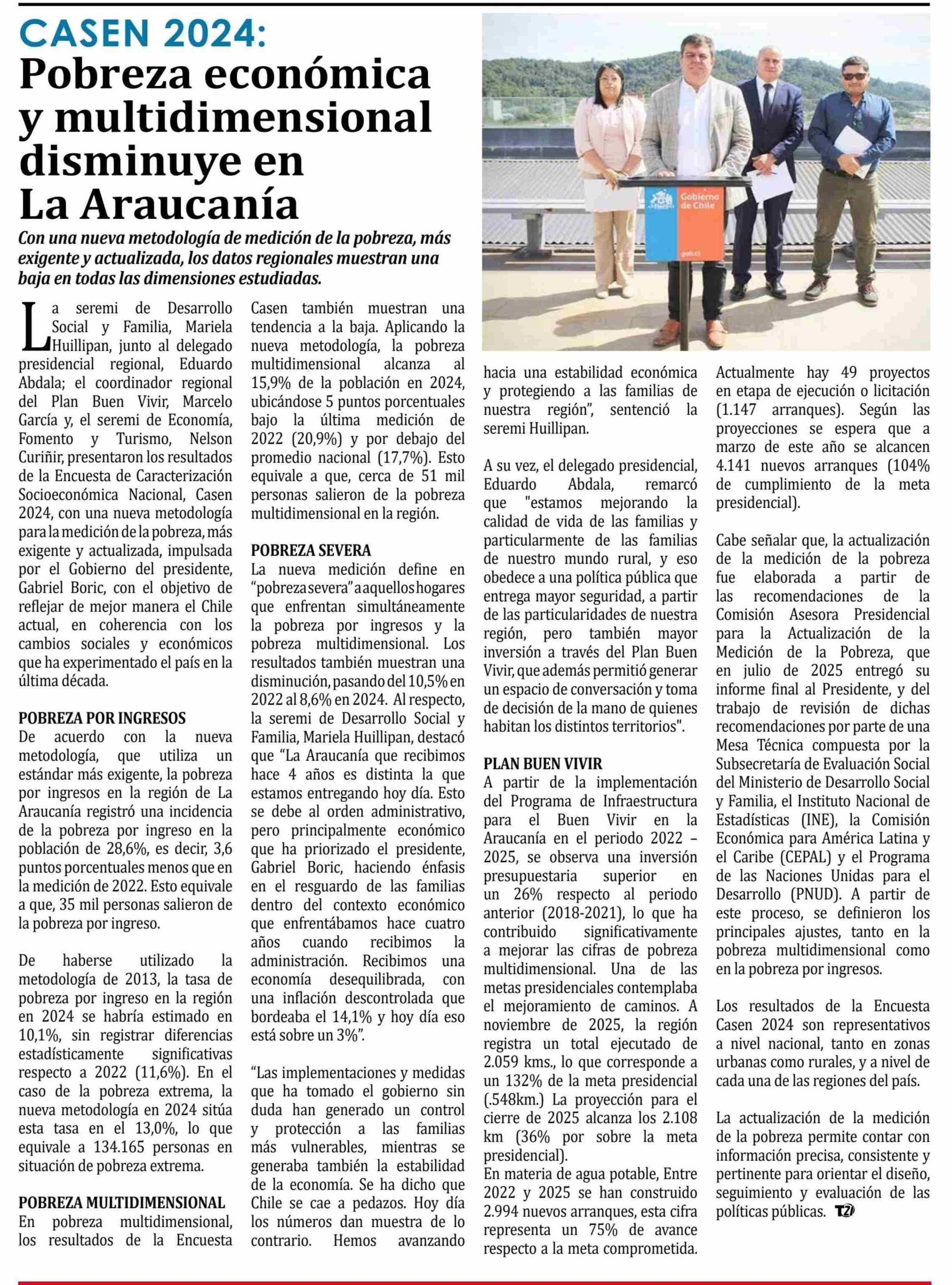 CASEN 2024: Pobreza económica y multidimensional disminuye en La Araucanía