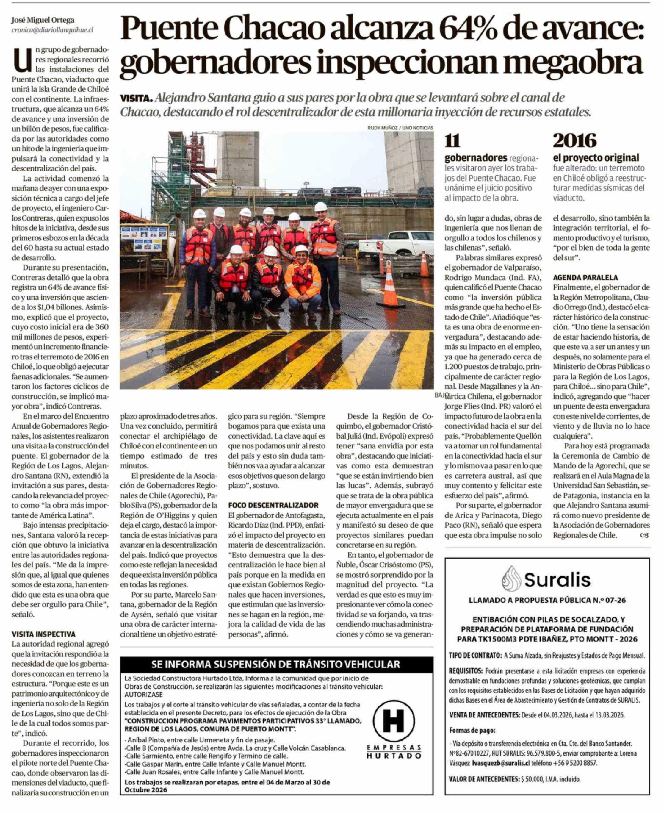 Puente Chacao alcanza 64% de avance: gobernadores inspeccionan megaobra