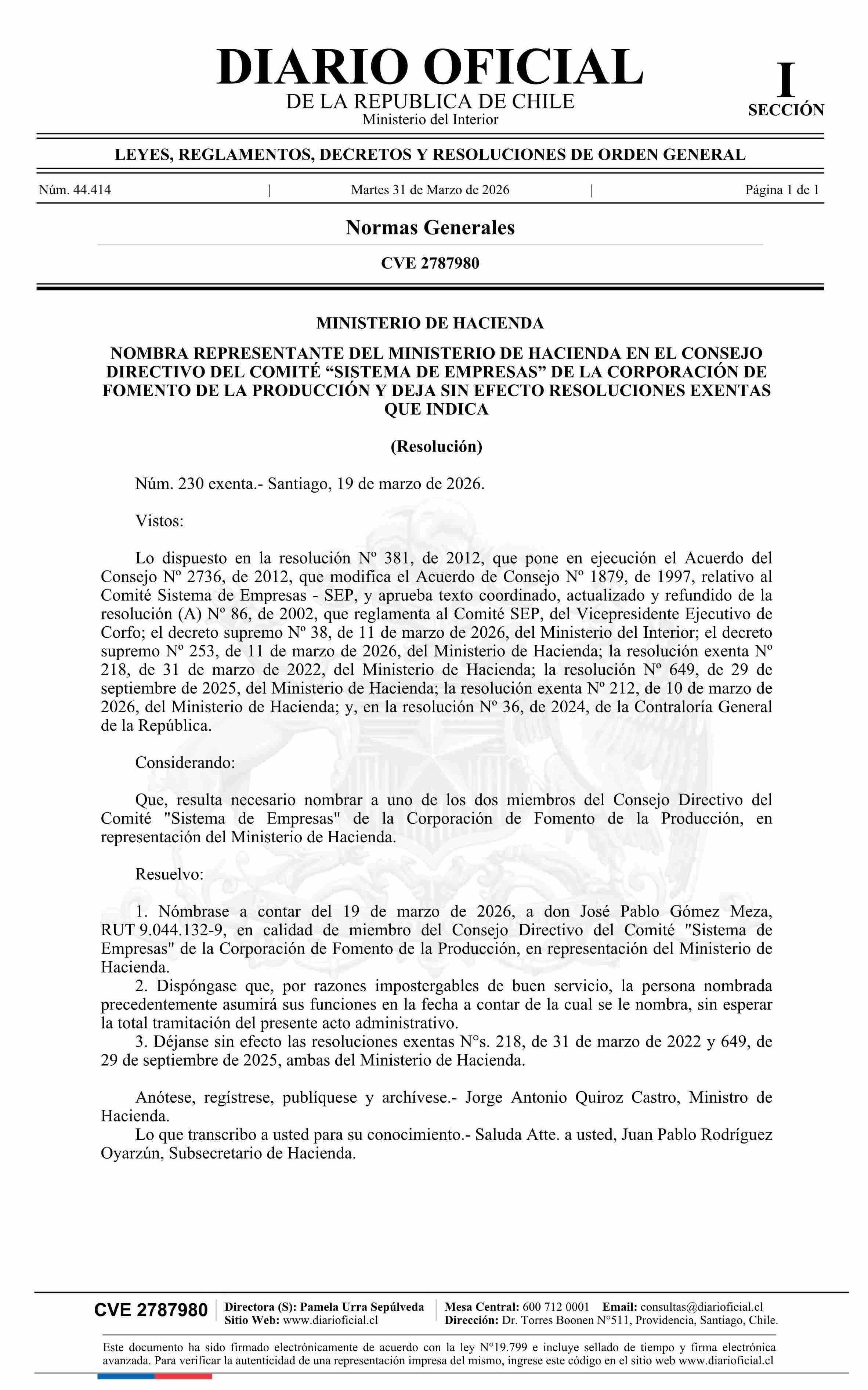 | Título: | MINISTERIO DE HACIENDA NOMBRA REPRESENTANTE DEL MINISTERIO DE HACIENDA EN EL CONSEJO DIRECTIVO DEL COMITÉ “SISTEMA DE EMPRESAS” DE LA CORPORACIÓN DE FOMENTO DE LA PRODUCCIÓN Y DEJA SIN EFECTO RESOLUCIONES EXENTAS QUE INDICA |