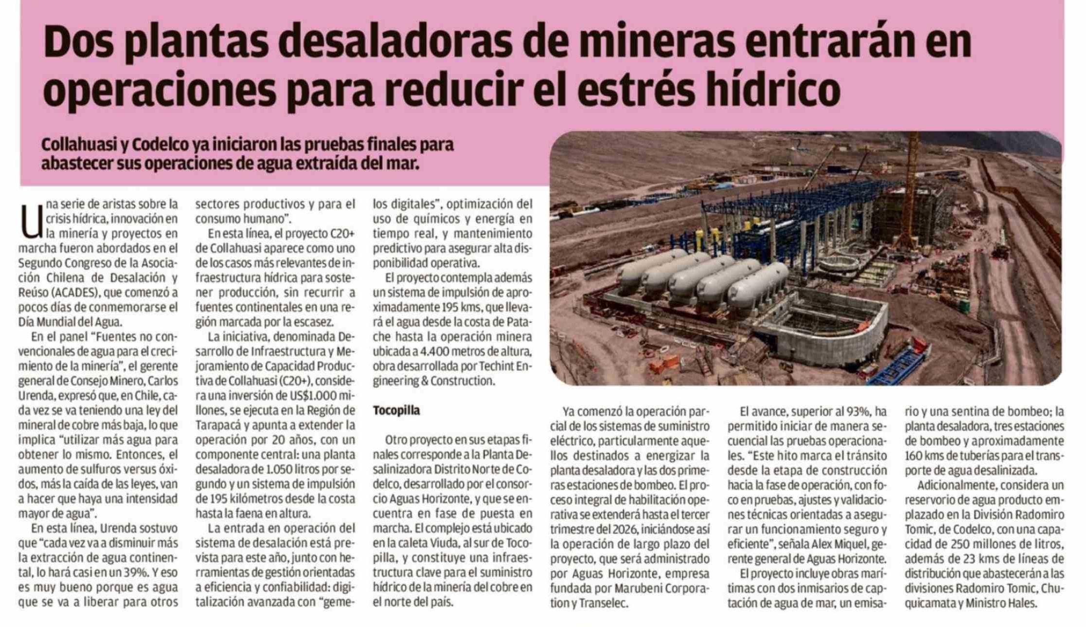 Dos plantas desaladoras de mineras entrarán en operaciones para reducir el estrés hídrico