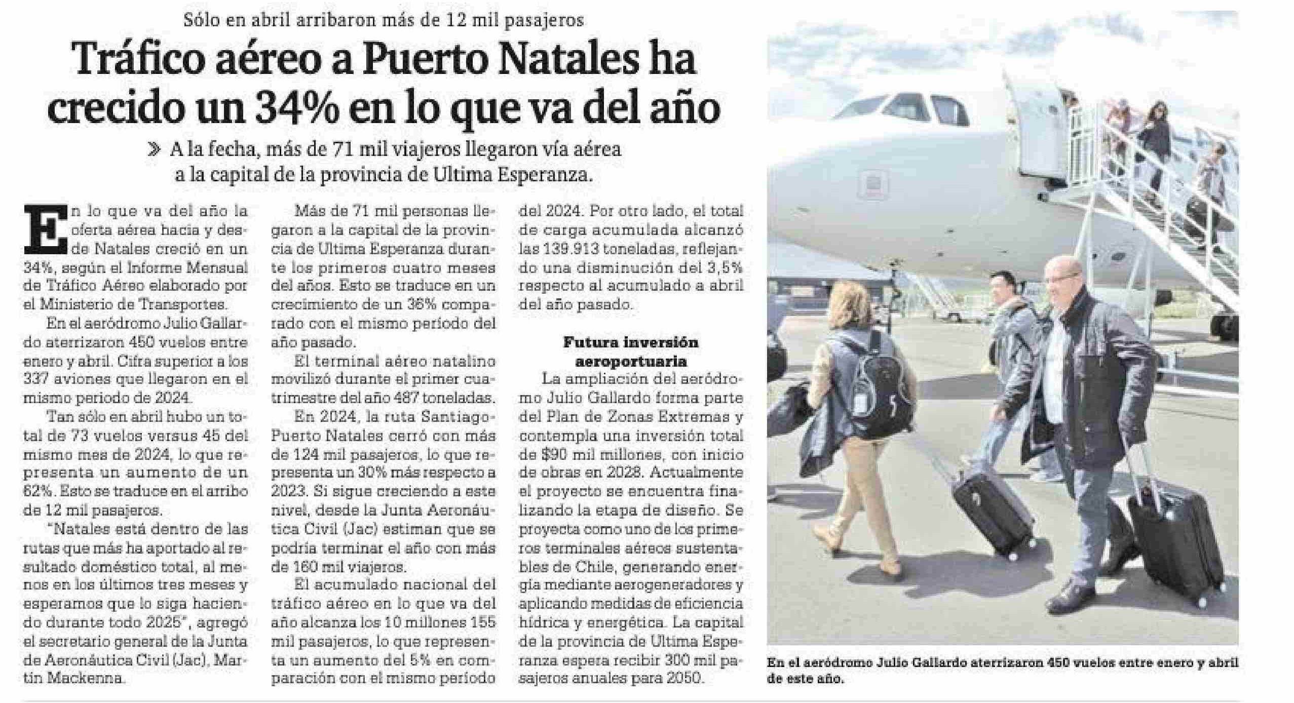 Tráfico aéreo a Puerto Natales ha crecido un 34% en lo que va del año