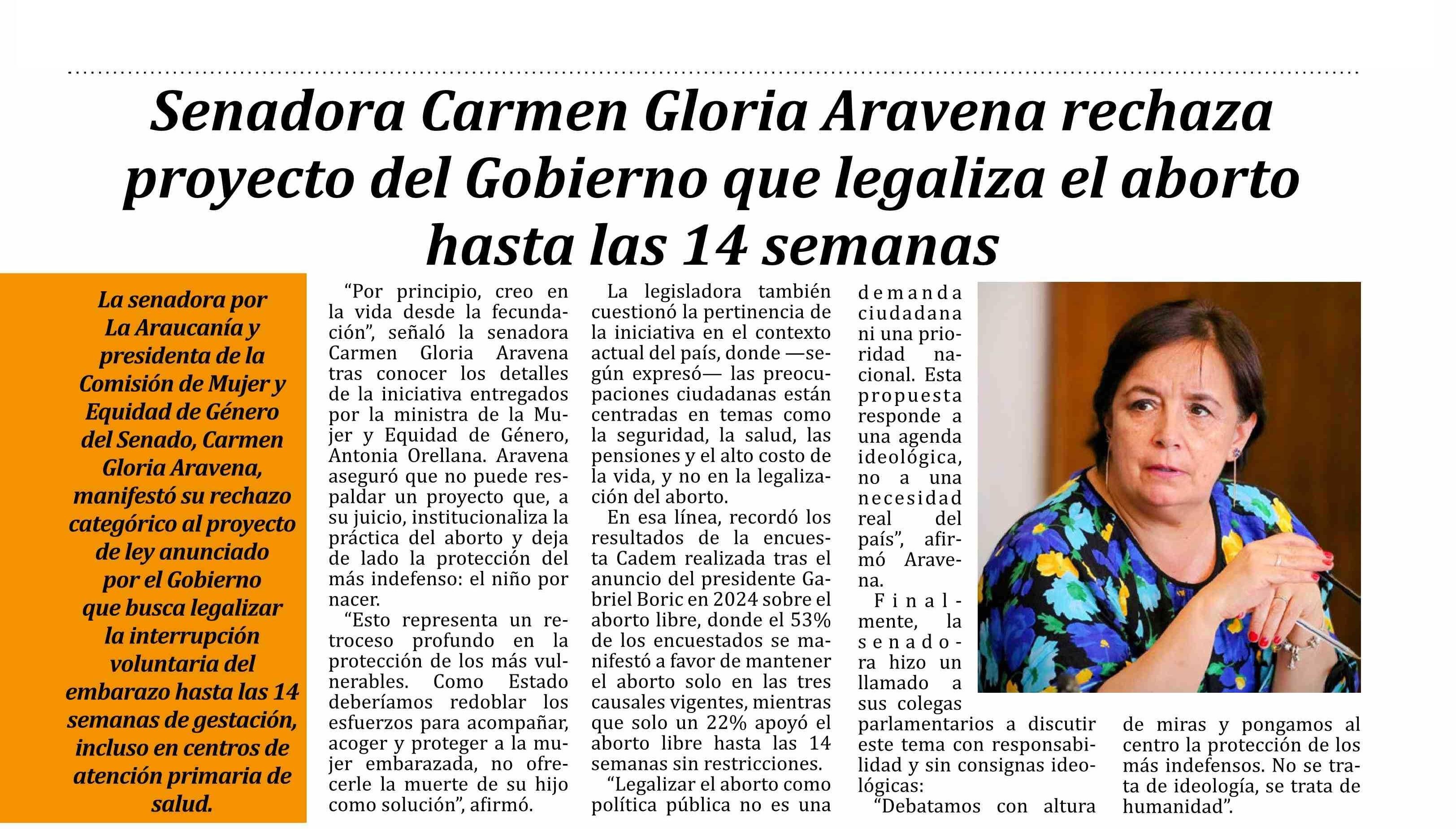 Senadora Carmen Gloria Aravena rechaza proyecto del Gobierno que legaliza el aborto hasta las 14 semanas