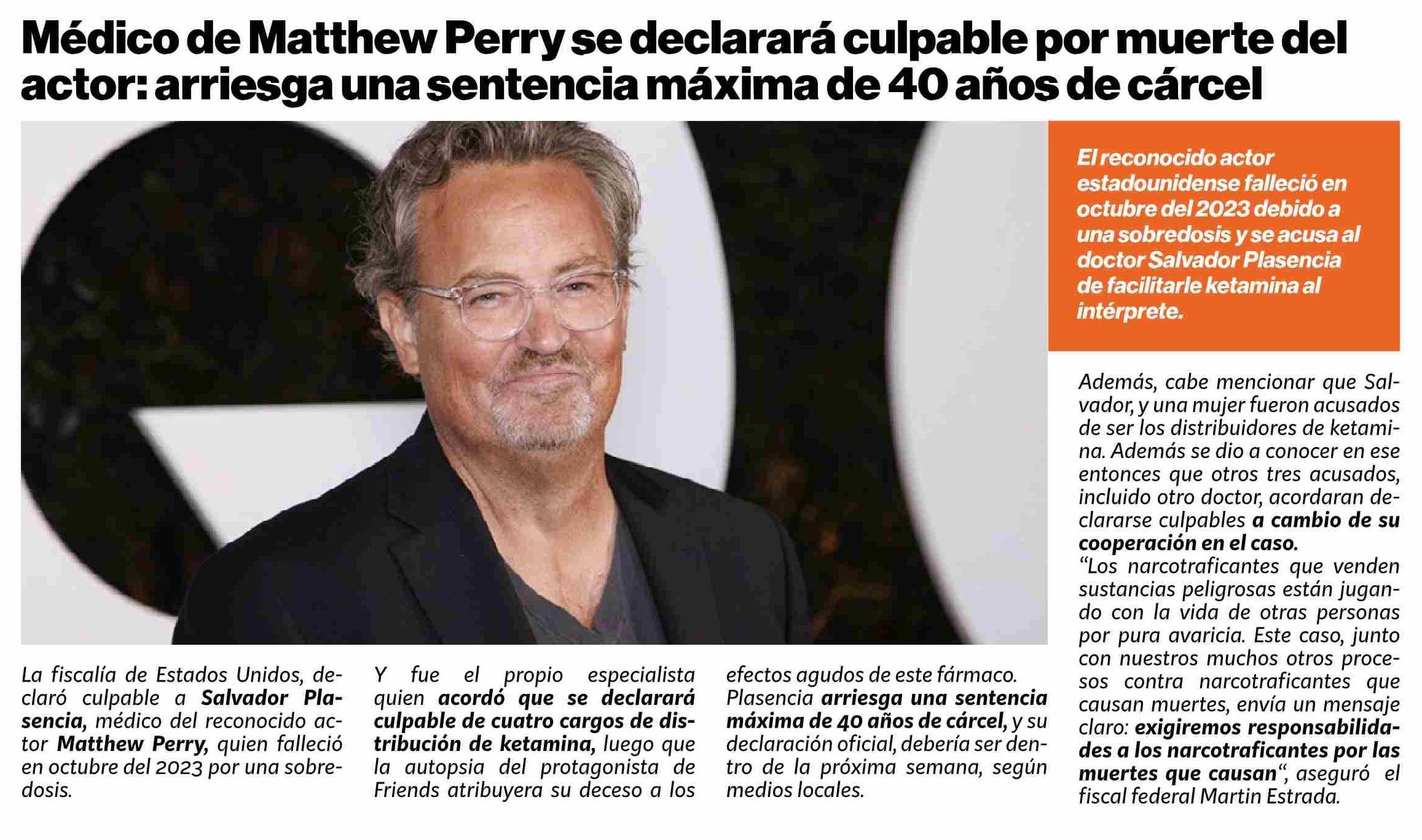 Médico de Matthew Perryse declarará culpable por muerte del actor: arriesga una sentencia máxima de 40 años de cárcel