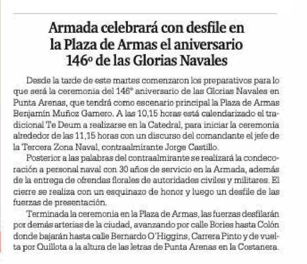 Armada celebrará con desfile en la Plaza de Armas el aniversario 146" de las Glorias Navales
