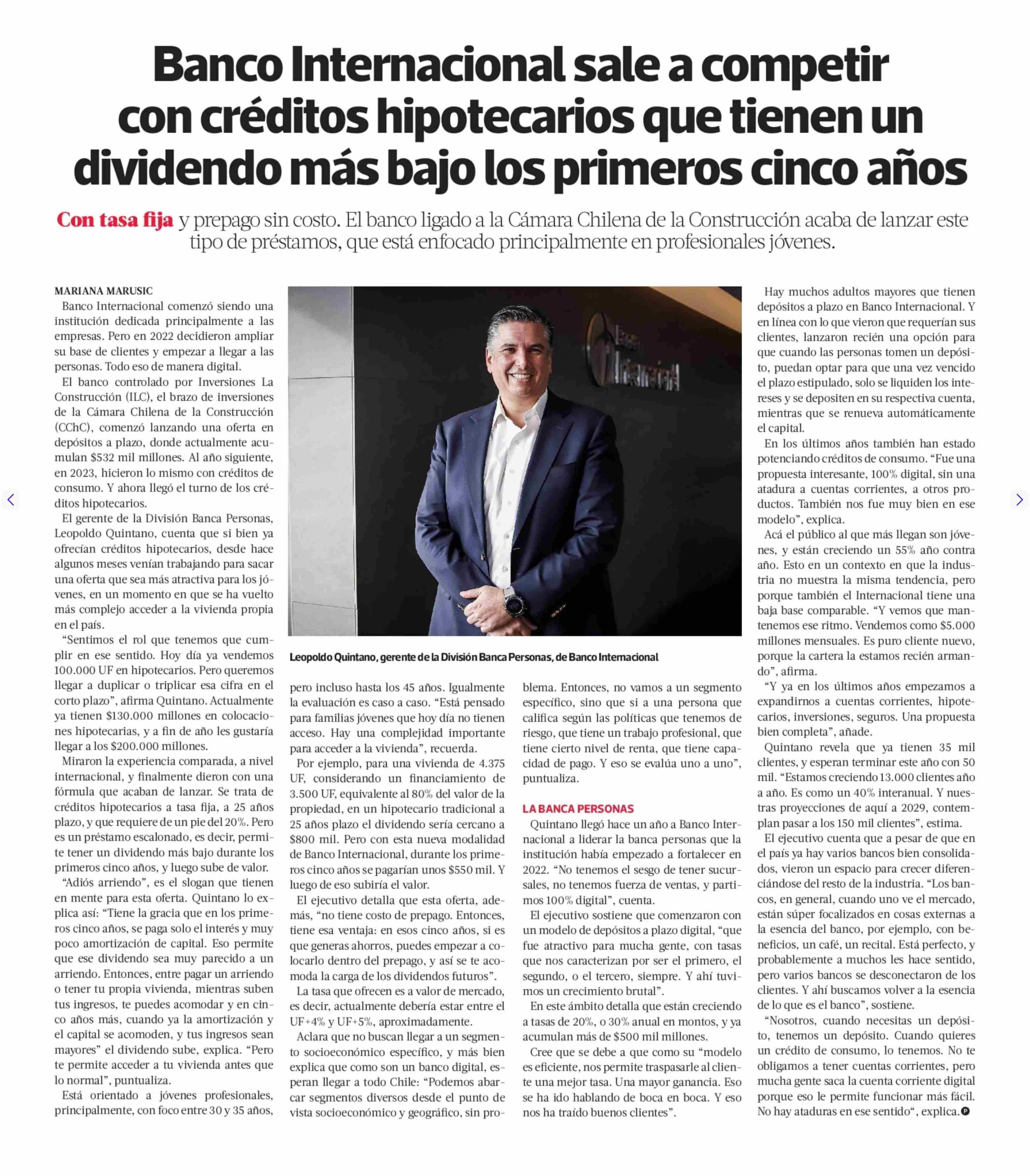 Banco Internacional sale a competir con créditos hipotecarios que tienen un dividendo más bajo los primeros cinco años