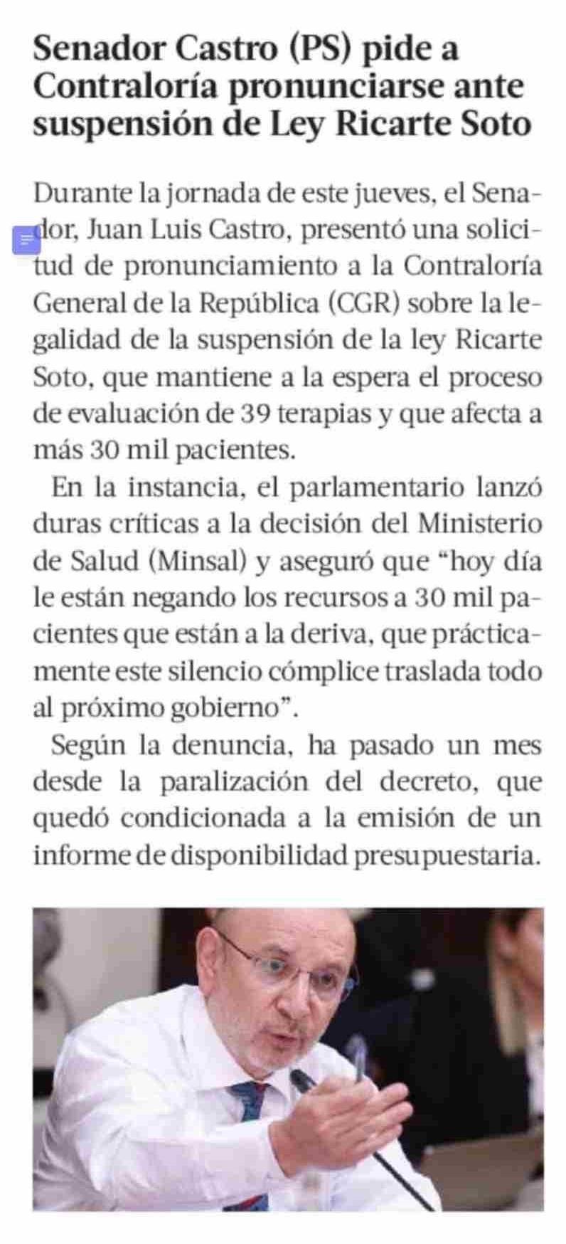 Senador Castro (PS) pide a Contraloría pronunciarse ante suspensión de Ley Ricarte Soto