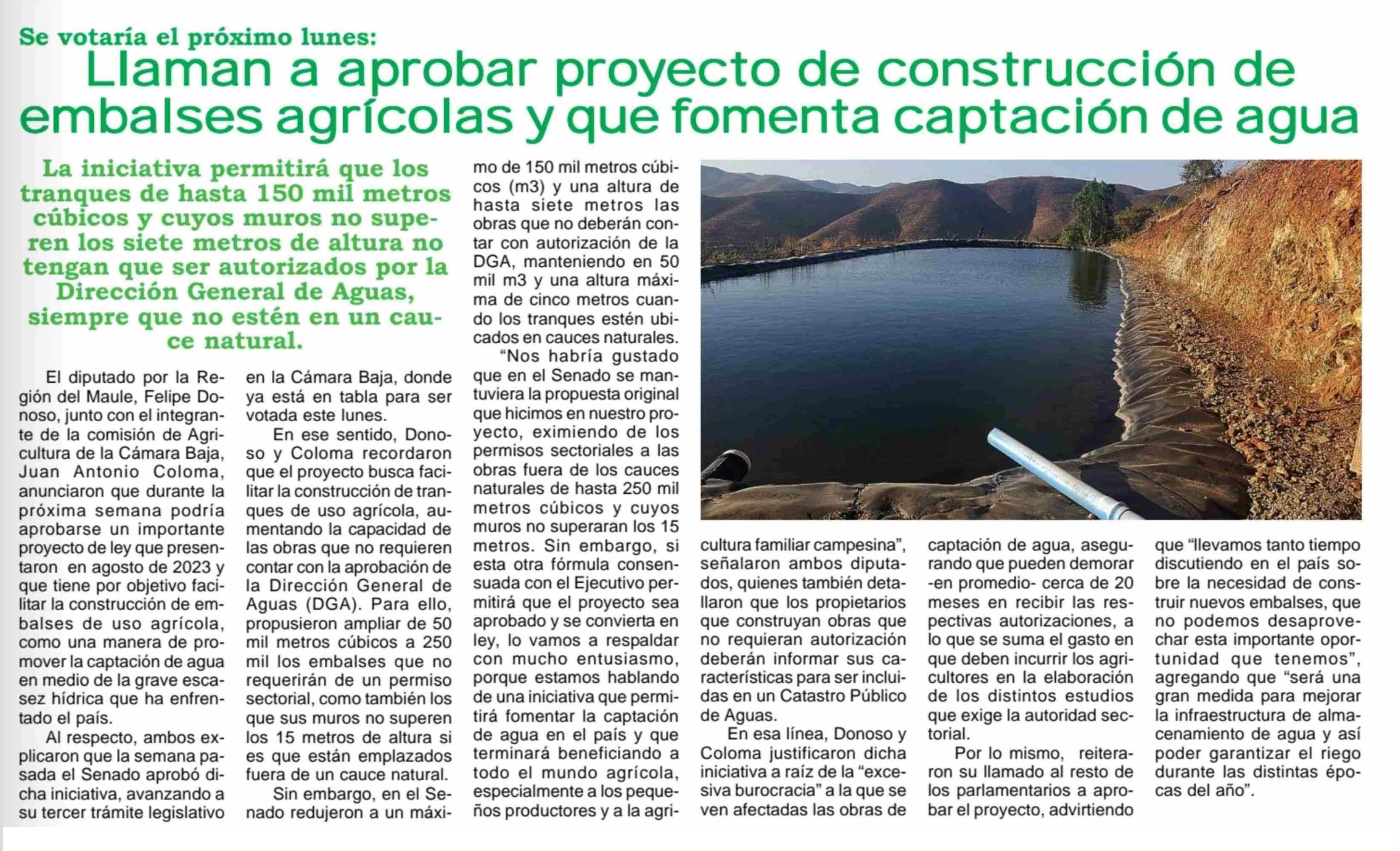Llaman a aprobar proyecto de construcción de embalses agrícolas y que fomenta captación de agua