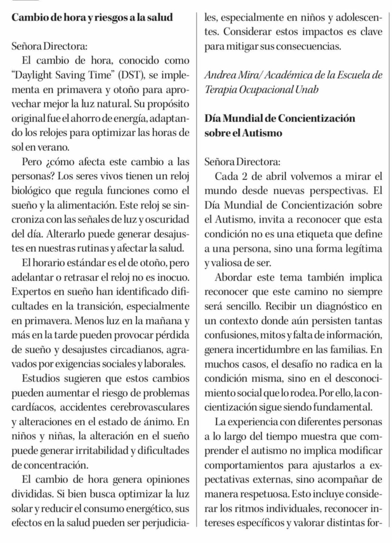 Cartas: Cambio de hora y riesgos a la salud
