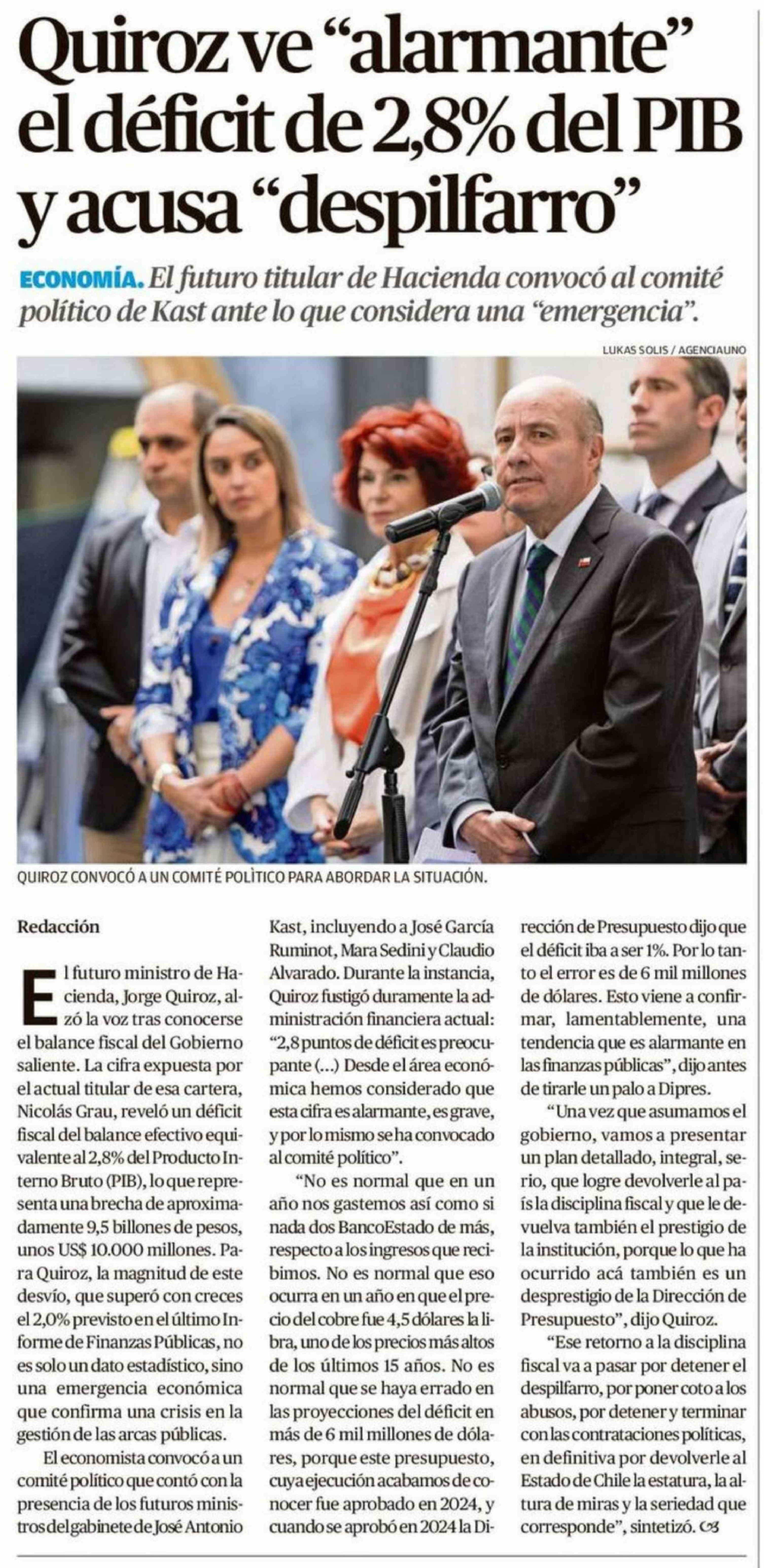 Quiroz ve "alarmante" el déficit de 2,8% del PIB y acusa "despilfarro"