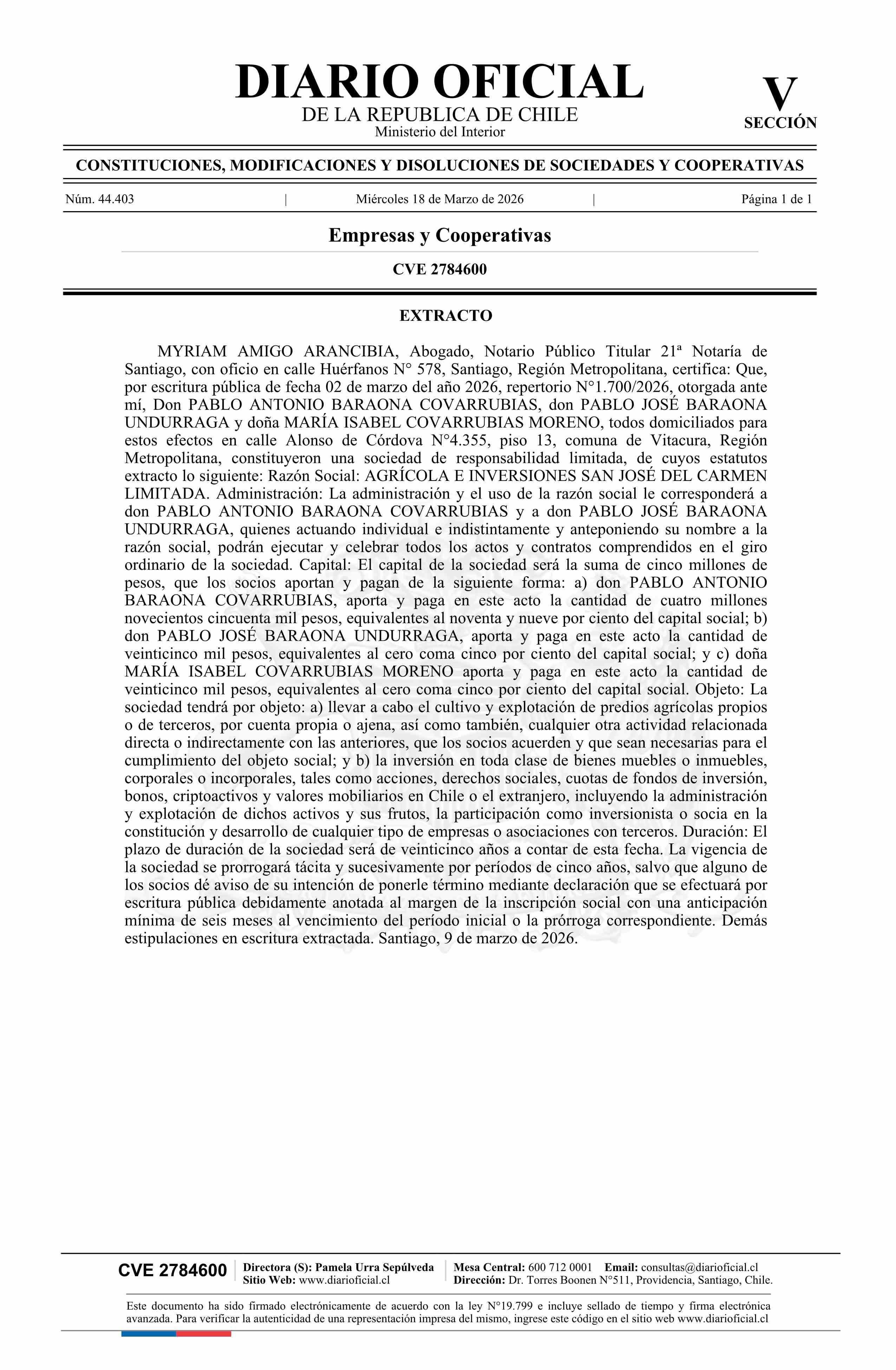 AGRÍCOLA E INVERSIONES SAN JOSÉ DEL CARMEN LIMITADA