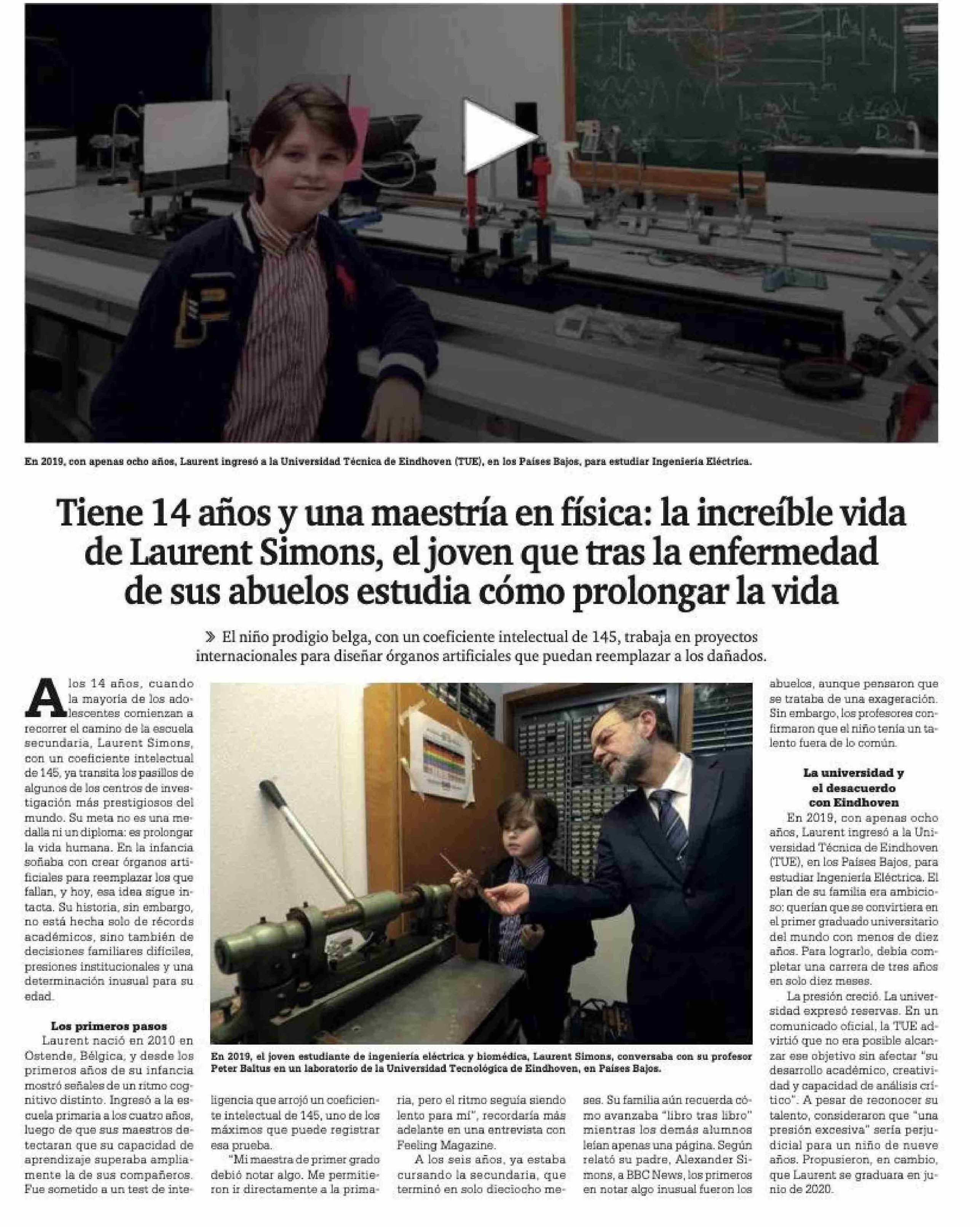Título: Tiene 14 años y una maestría en física: la increíble vida de Laurent Simons, el joven que tras la enfermedad de sus abuelos estudia cómo prolongar la vida