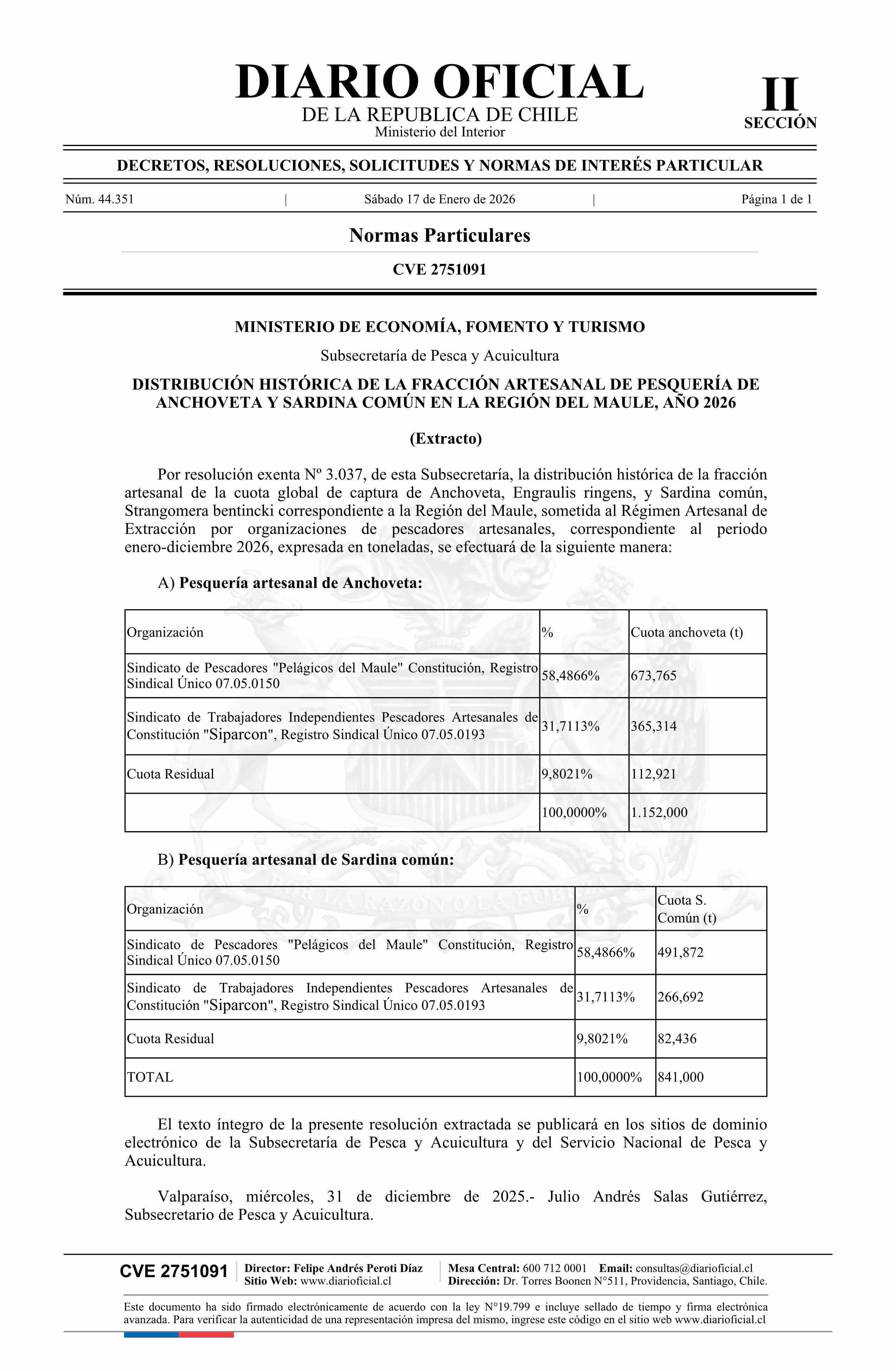 | Título: | Extracto de resolución exenta número 3.037, de 2025.- Establece distribución histórica de la fracción artesanal de pesquería de Anchoveta y Sardina común en la Región del Maule, año 2026 |