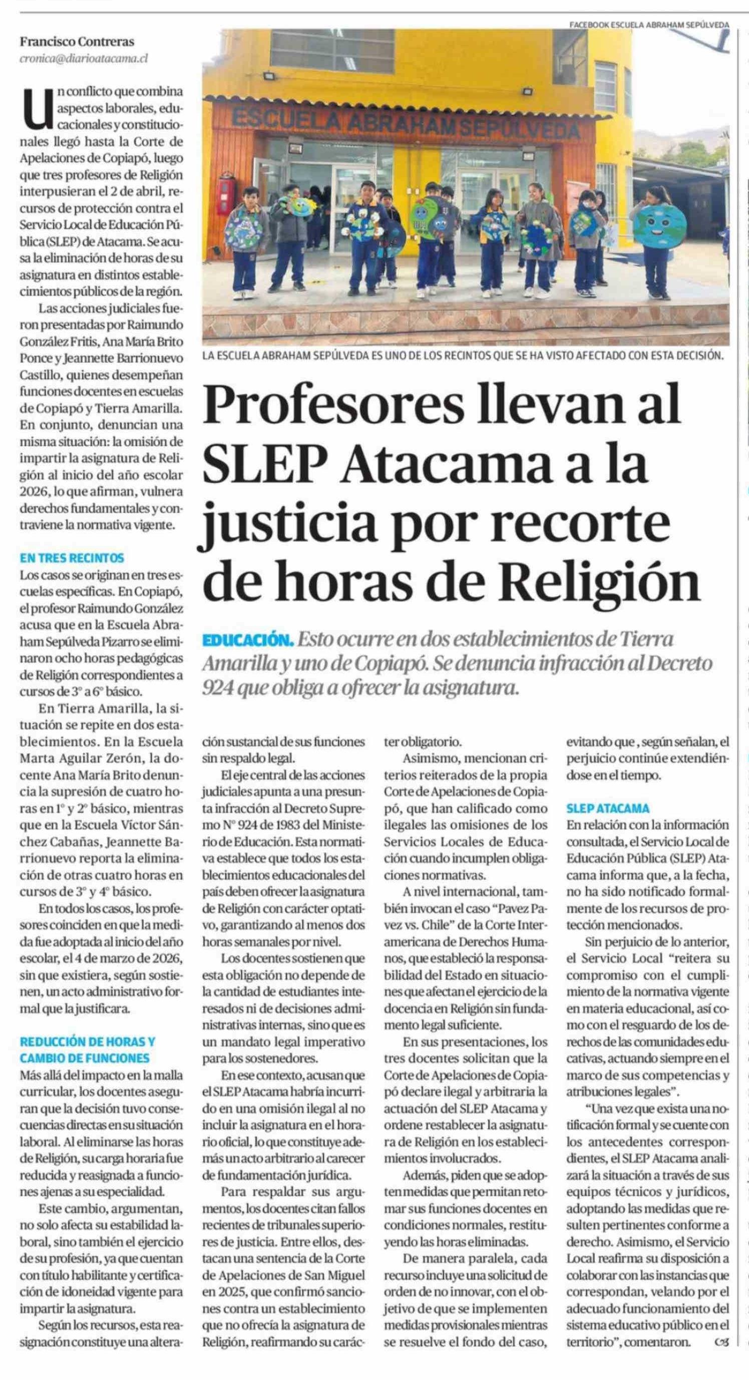 Profesores llevan al SLEP Atacama a la justicia por recorte de horas de Religión