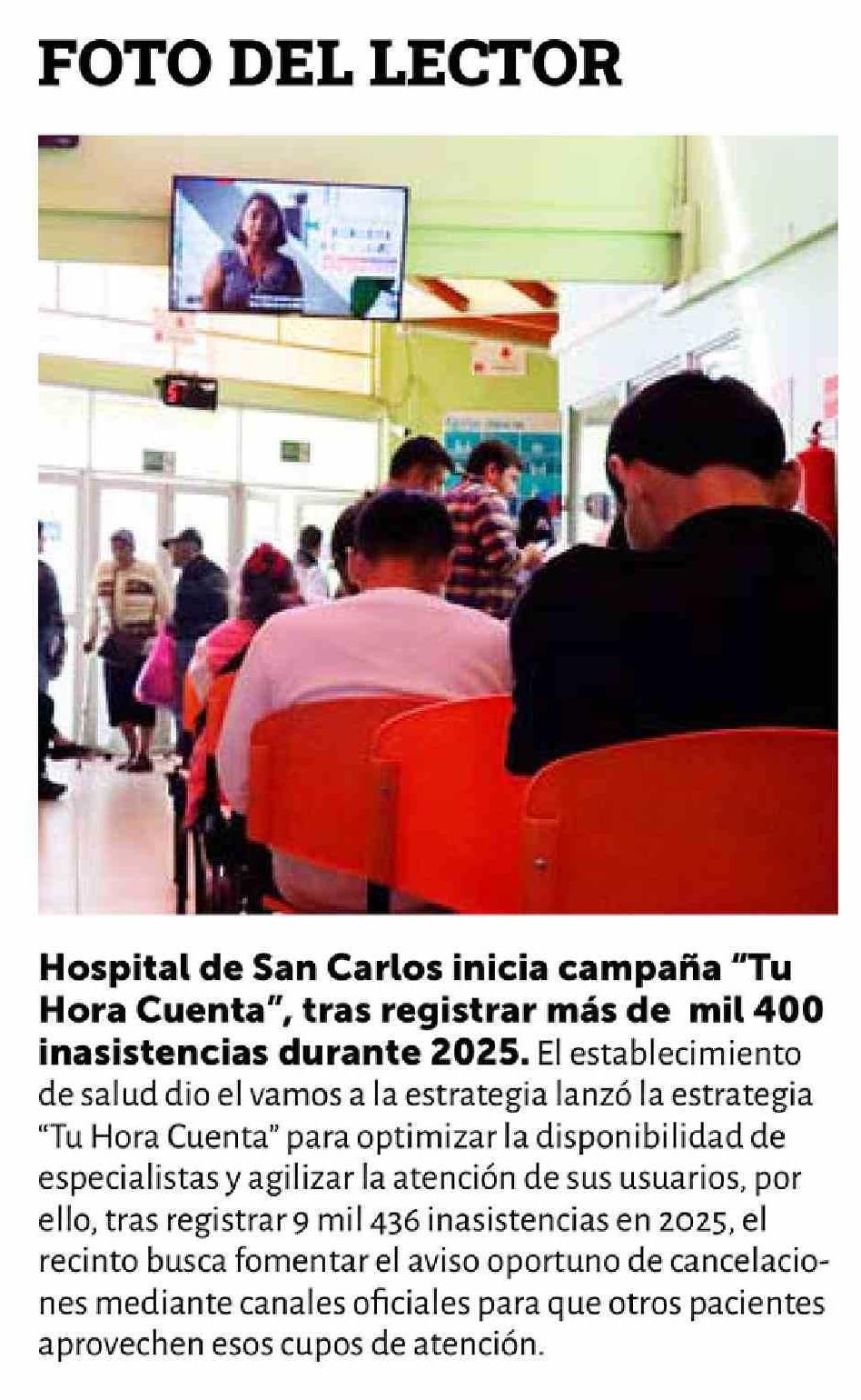 Título: Hospital de San Carlos inicia campaña "Tu Hora Cuenta", tras registrar mas de mil 400 inasistencias durante 2025. El establecimiento