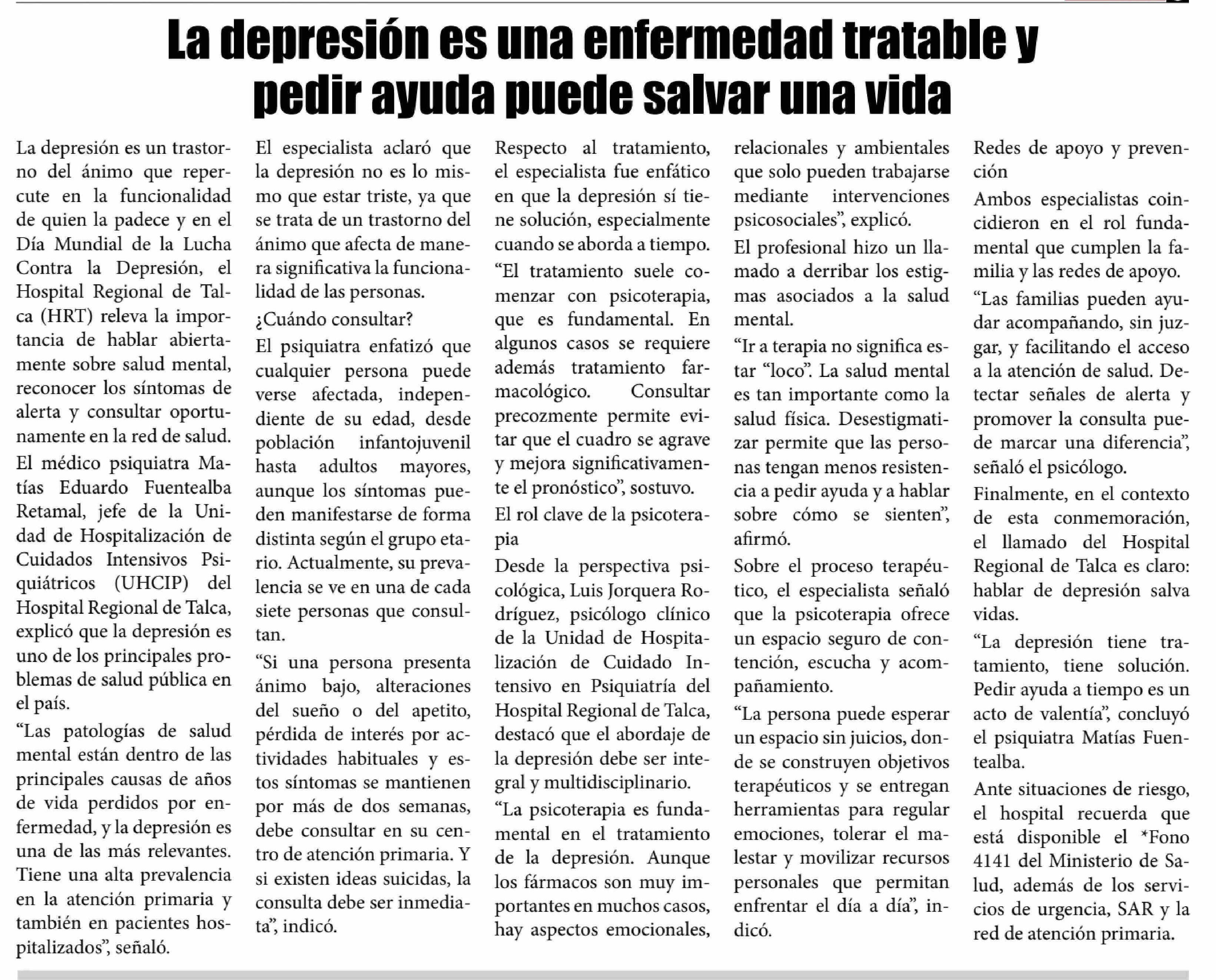 La depresión es una enfermedad tratable y pedir ayuda puede salvar una vida