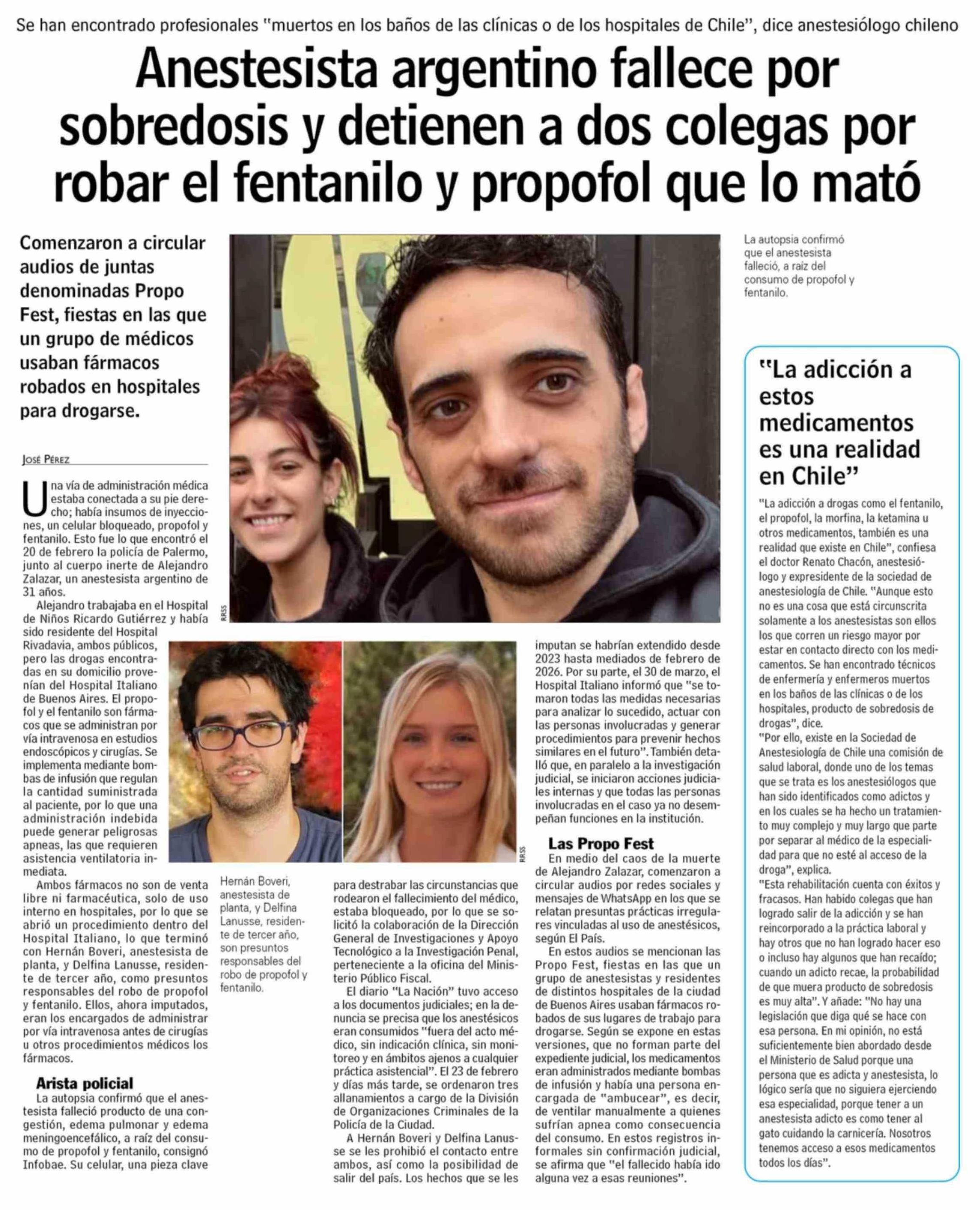 Anestesista argentino fallece por sobredosis y detienen a dos colegas por robar el fentanilo y propofol que lo mató