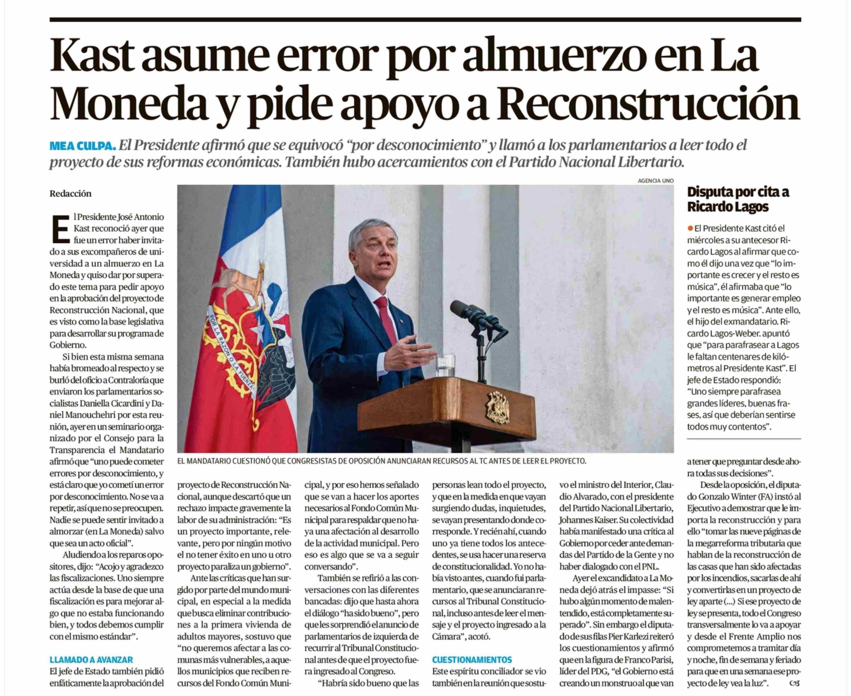 Kast asume error por almuerzo en La Moneda y pide apoyo a Reconstrucción