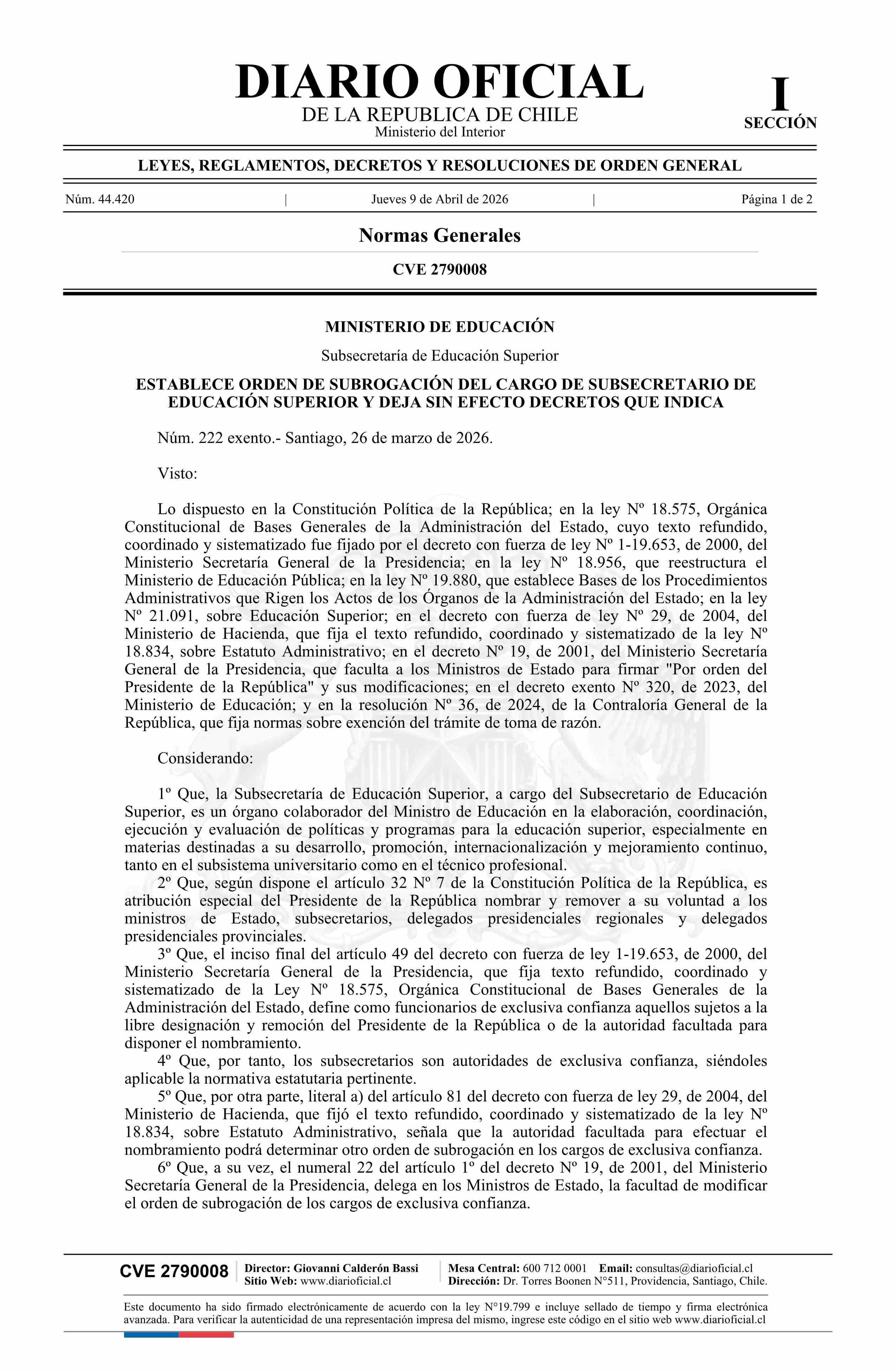 | Título: | Decreto exento número 222, de 2026.- Establece orden de subrogación del cargo de Subsecretario de Educación Superior y deja sin efecto decreto 320 exento, de 2023 |