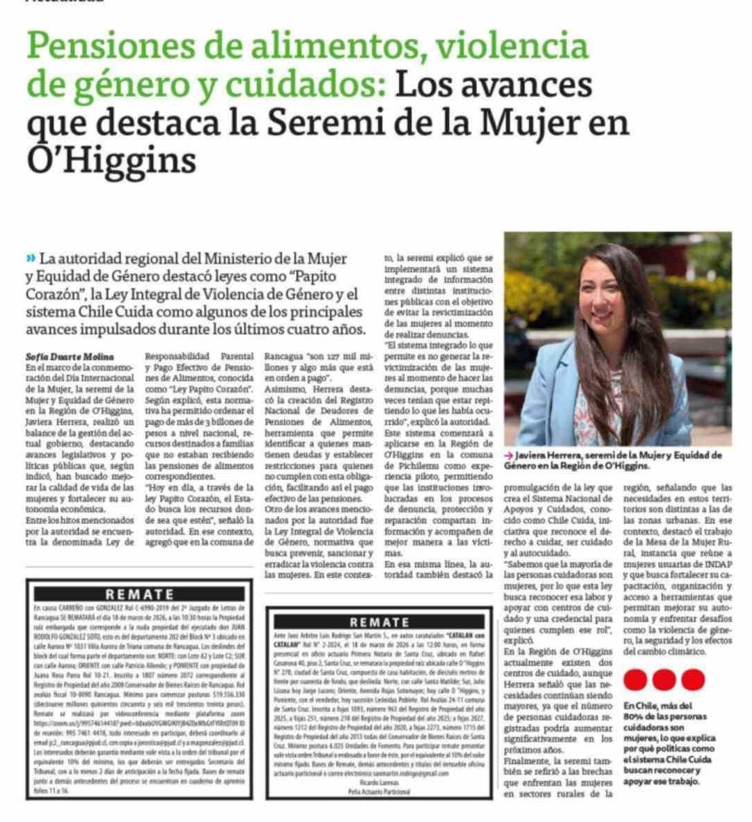 Pensiones de alimentos, violencia de género y cuidados: Los avances que destaca la Seremi de la Mujer en Ó'Higgins