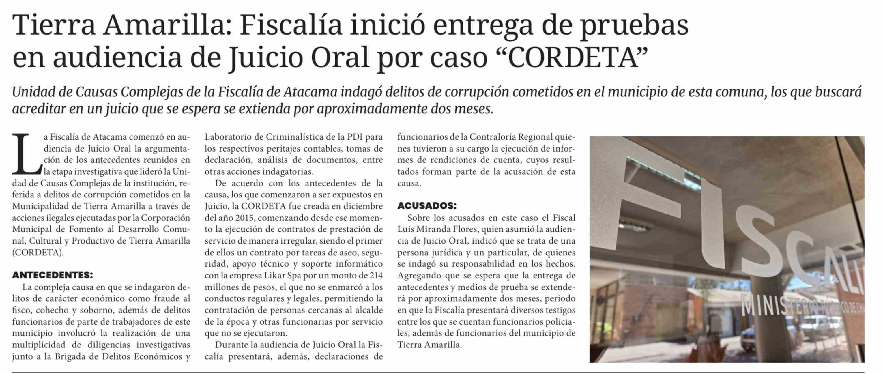 Tierra Amarilla: Fiscalía inició entrega de pruebas en audiencia de Juicio Oral por caso "CORDETA"