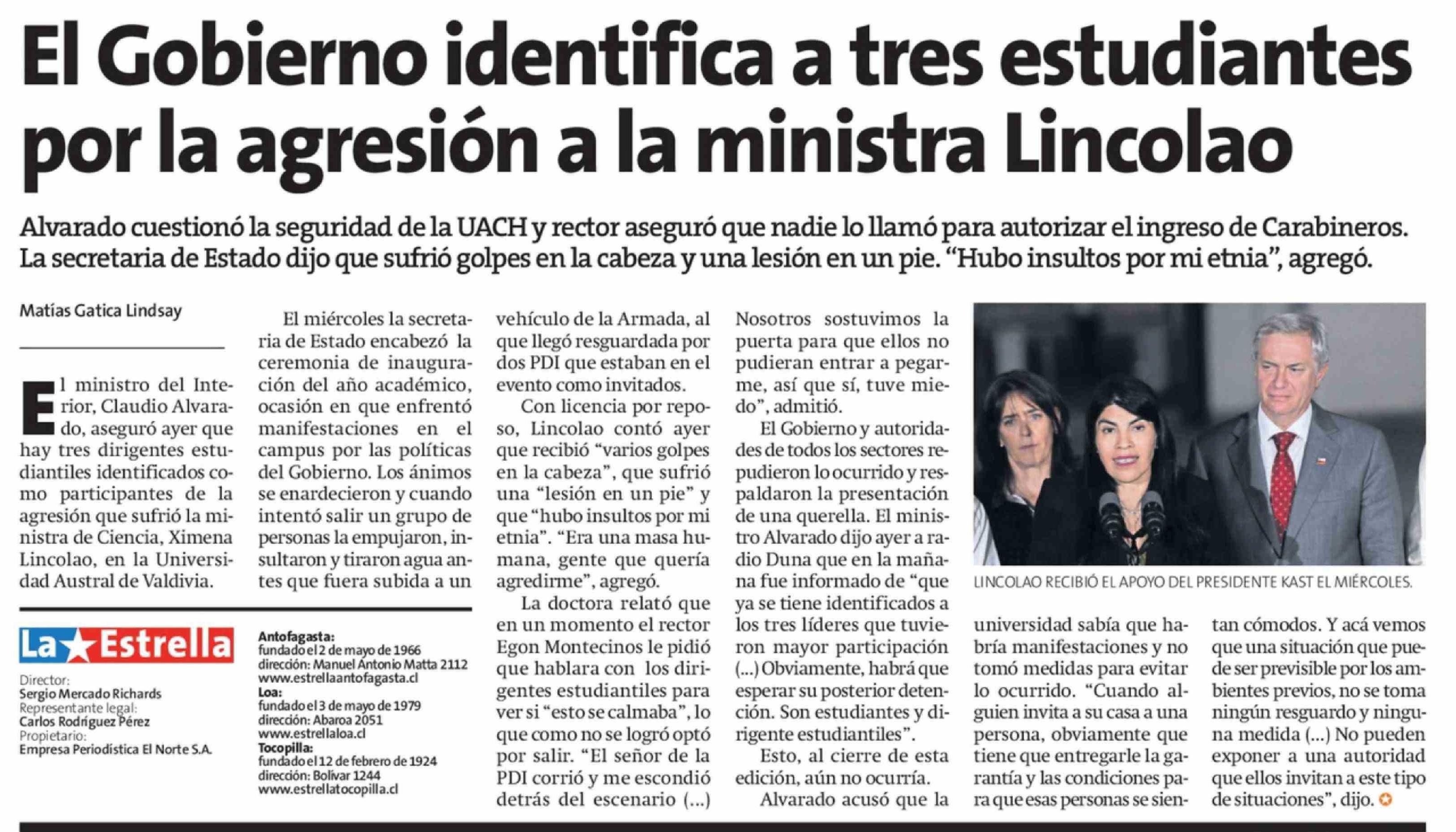 El Gobierno identifica a tres estudiantes por la agresión a la ministra Lincolao
