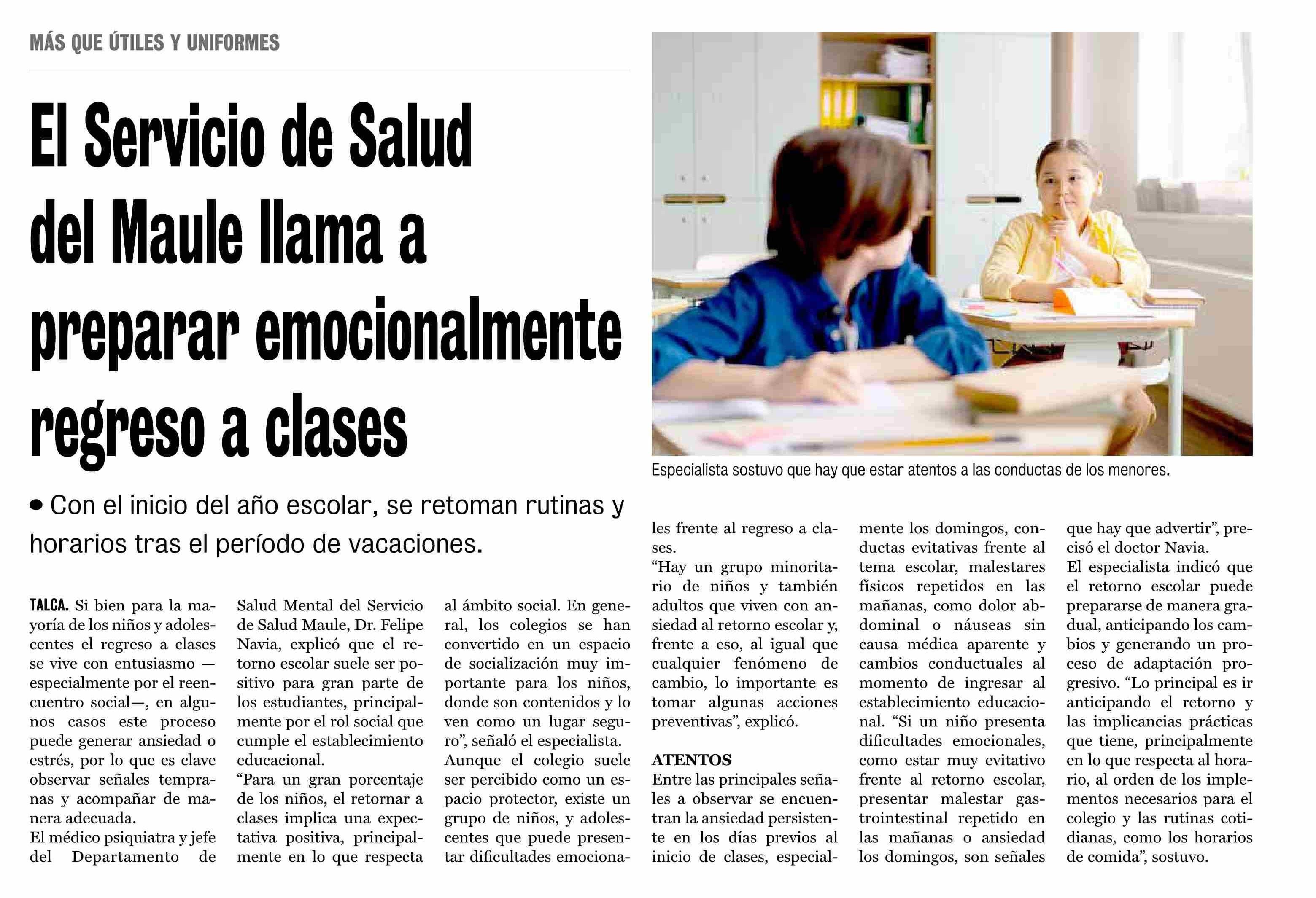 El Servicio de Salud del Maule llama a preparar emocionalmente regreso a clases