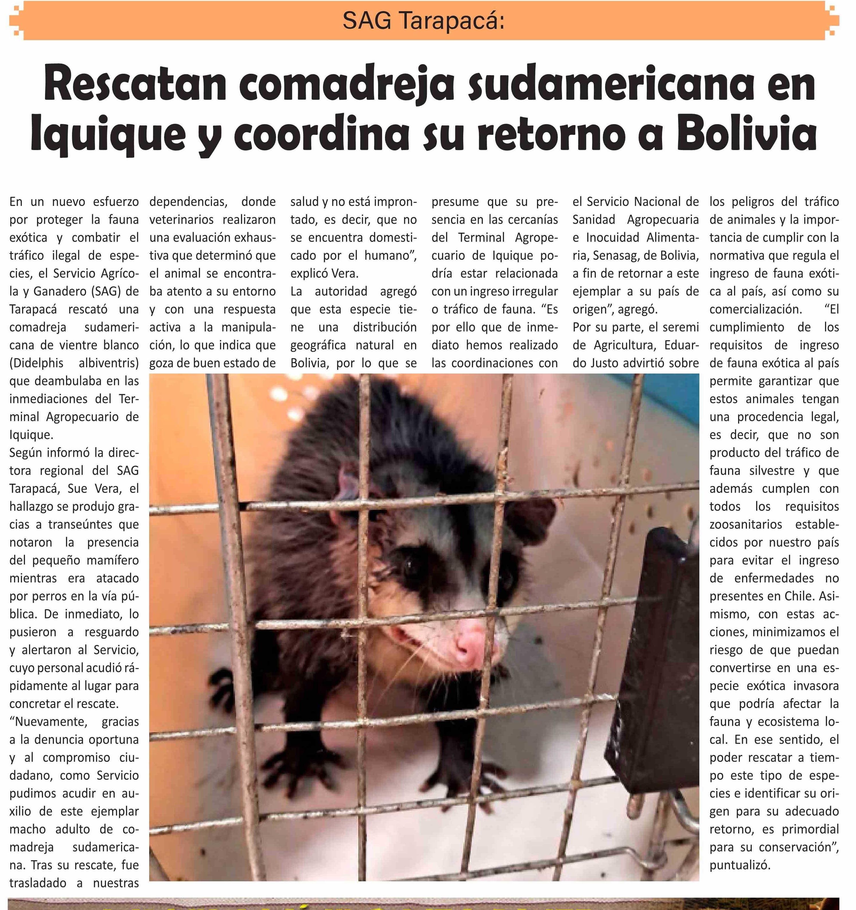 Rescatan comadreja sudamericana en Iquique y coordina su retorno a Bolivia