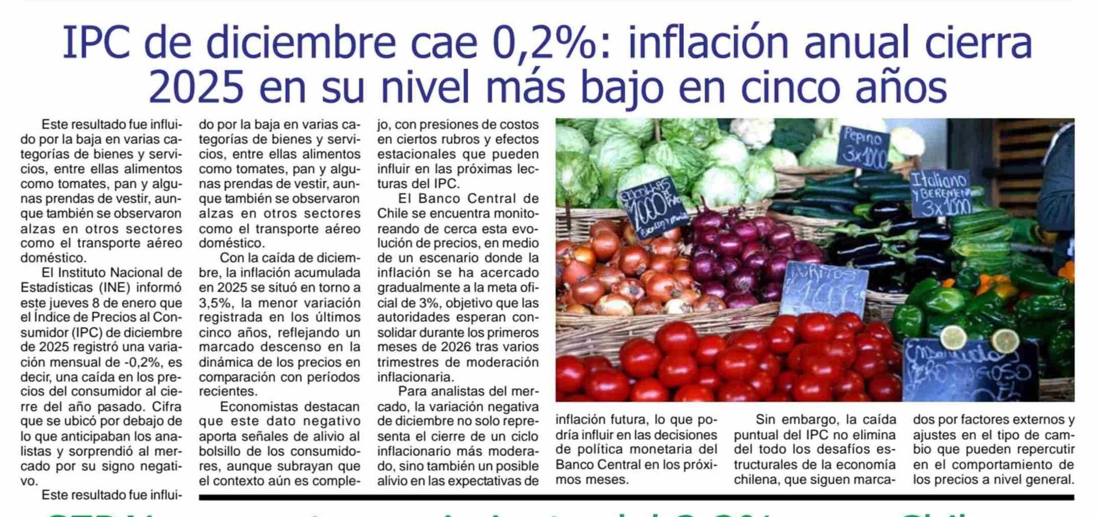 IPC de diciembre cae 0,2%: inflación anual cierra 2025 en su nivel más bajo en cinco años